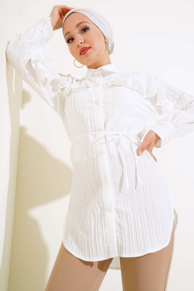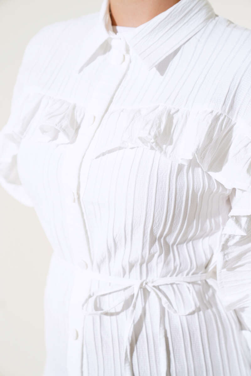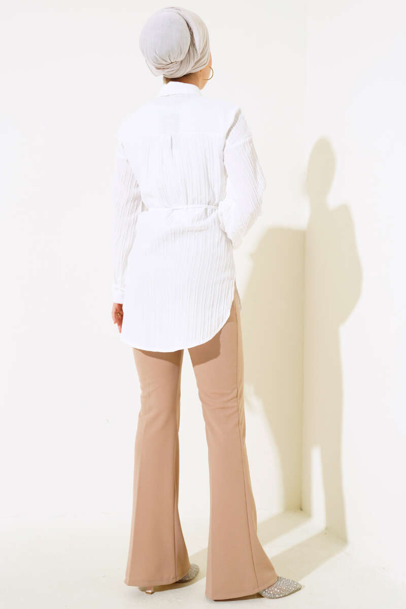 Gizli Düğmeli Bel Kuşaklı Gömlek Beyaz