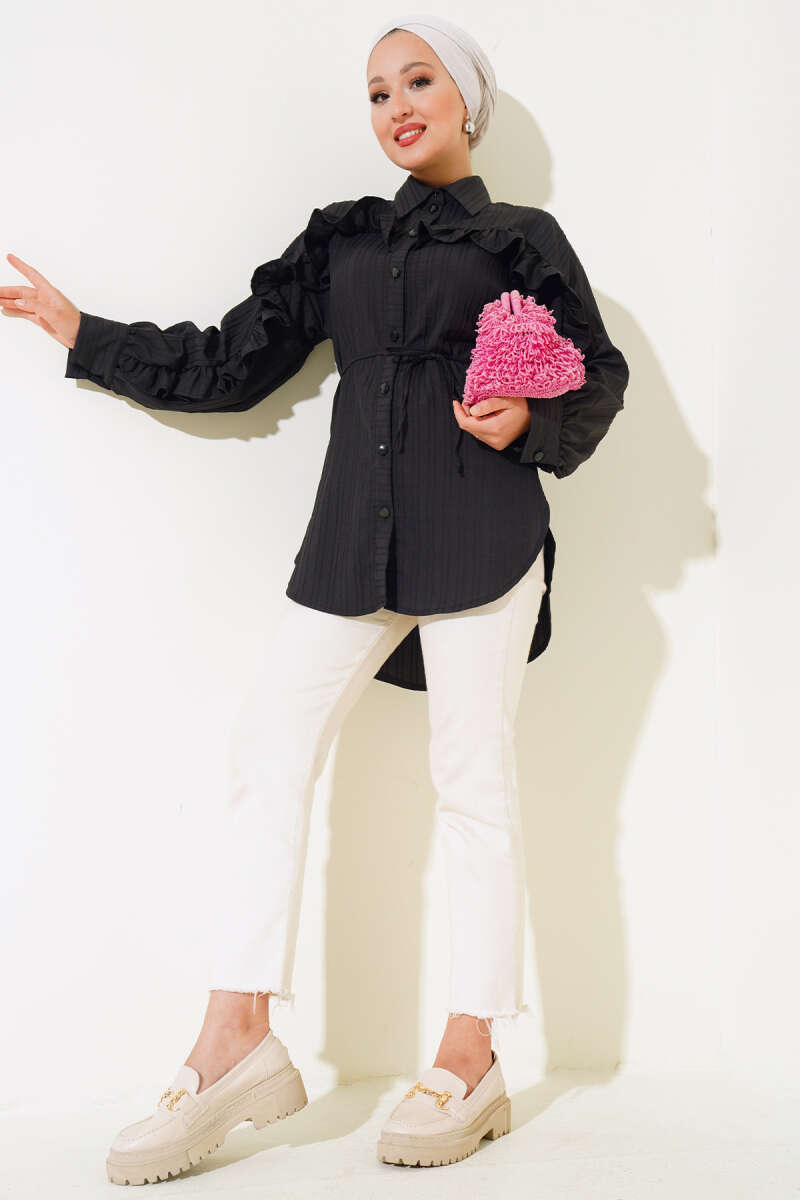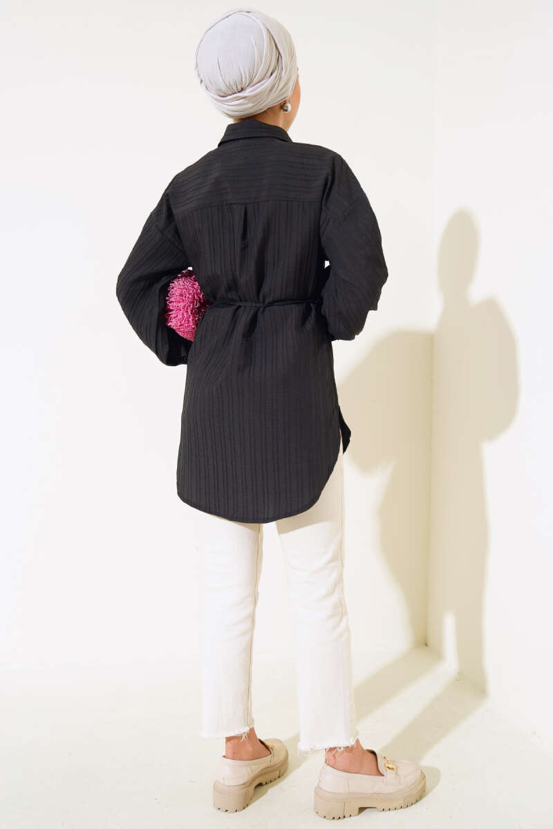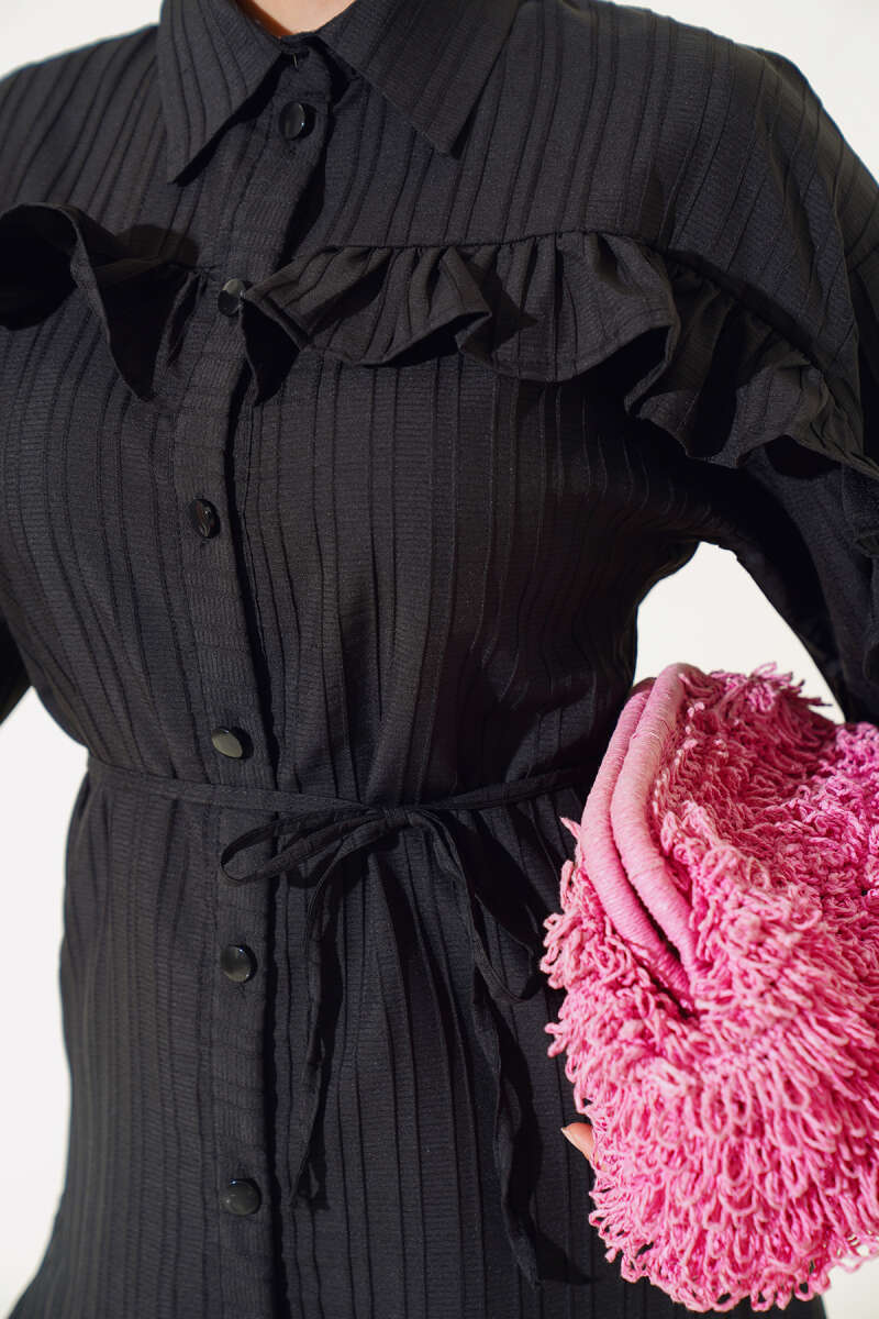 Yarım Düğmeli Garnili Kuşaklı Elbise Siyah