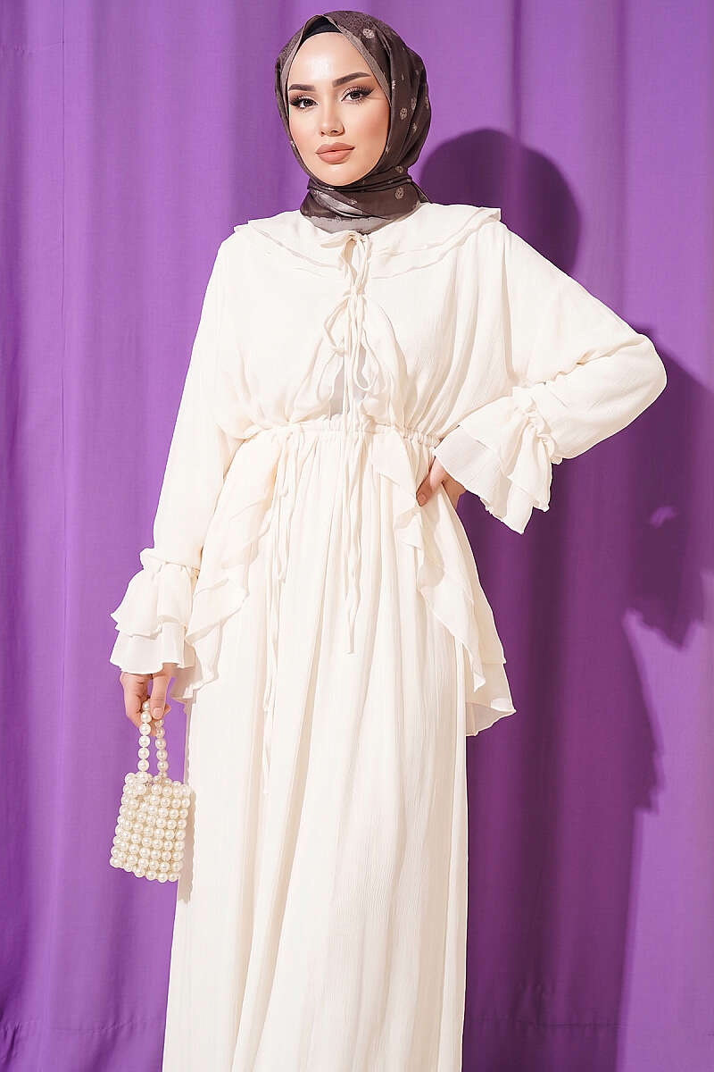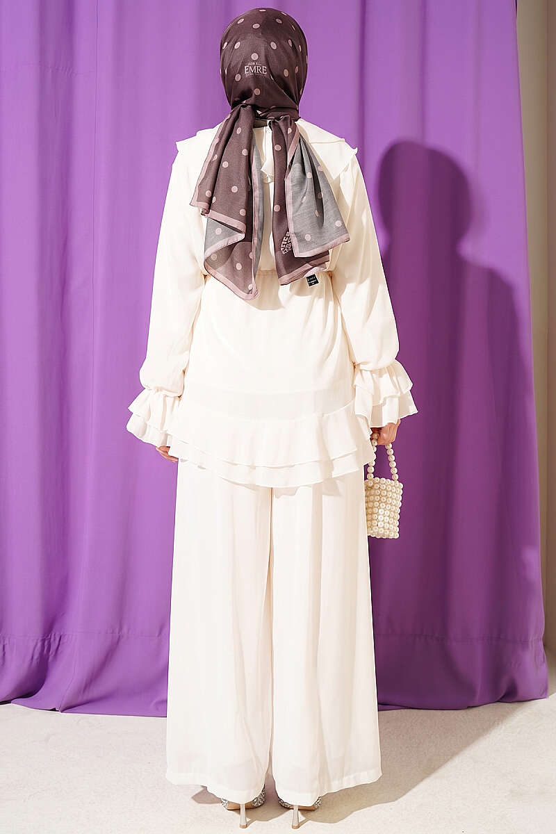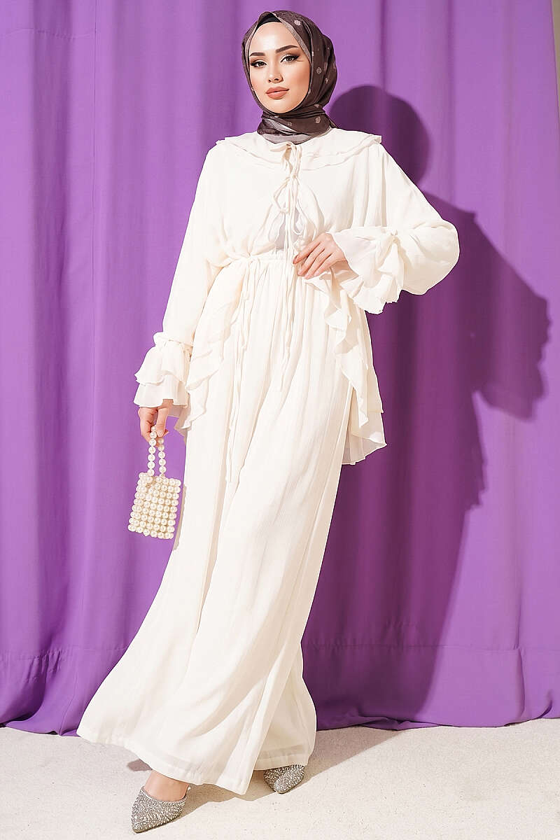 Fırfırlı İp Bağcıklı Şifon İkili Takım Bej
