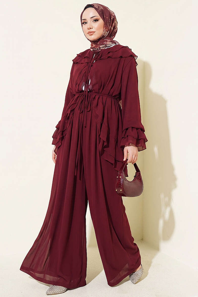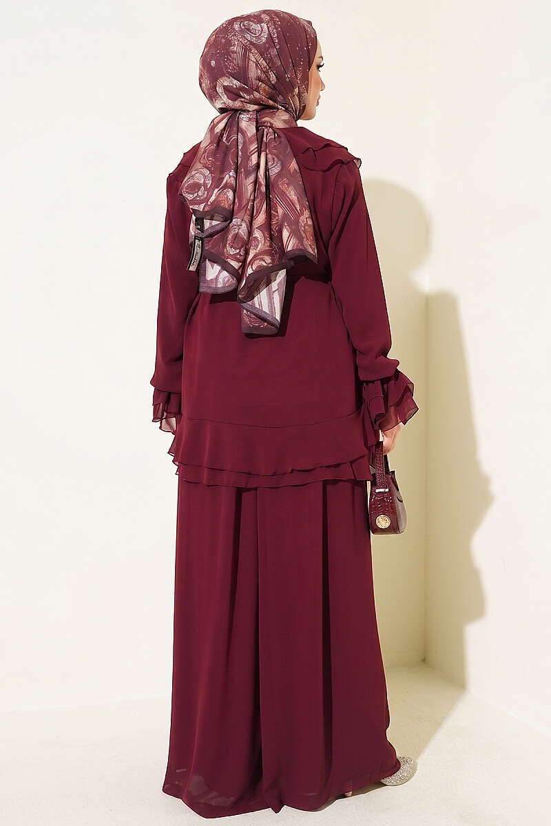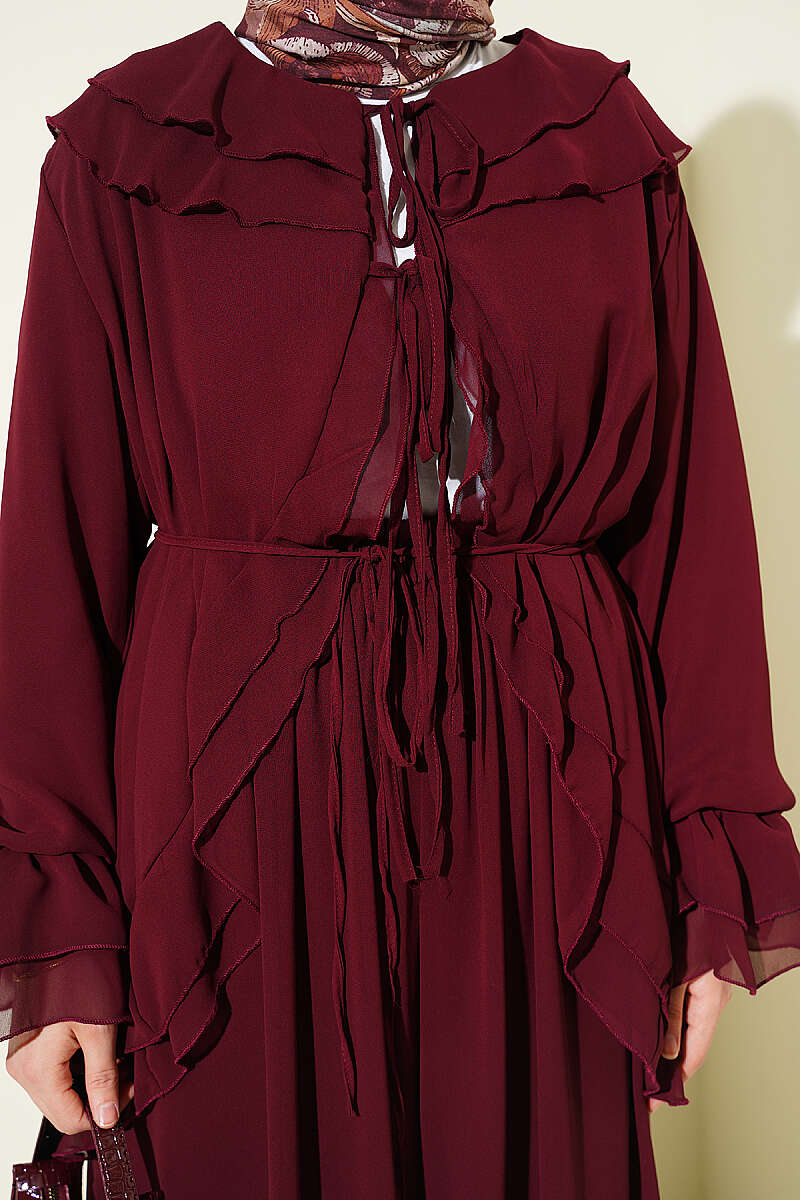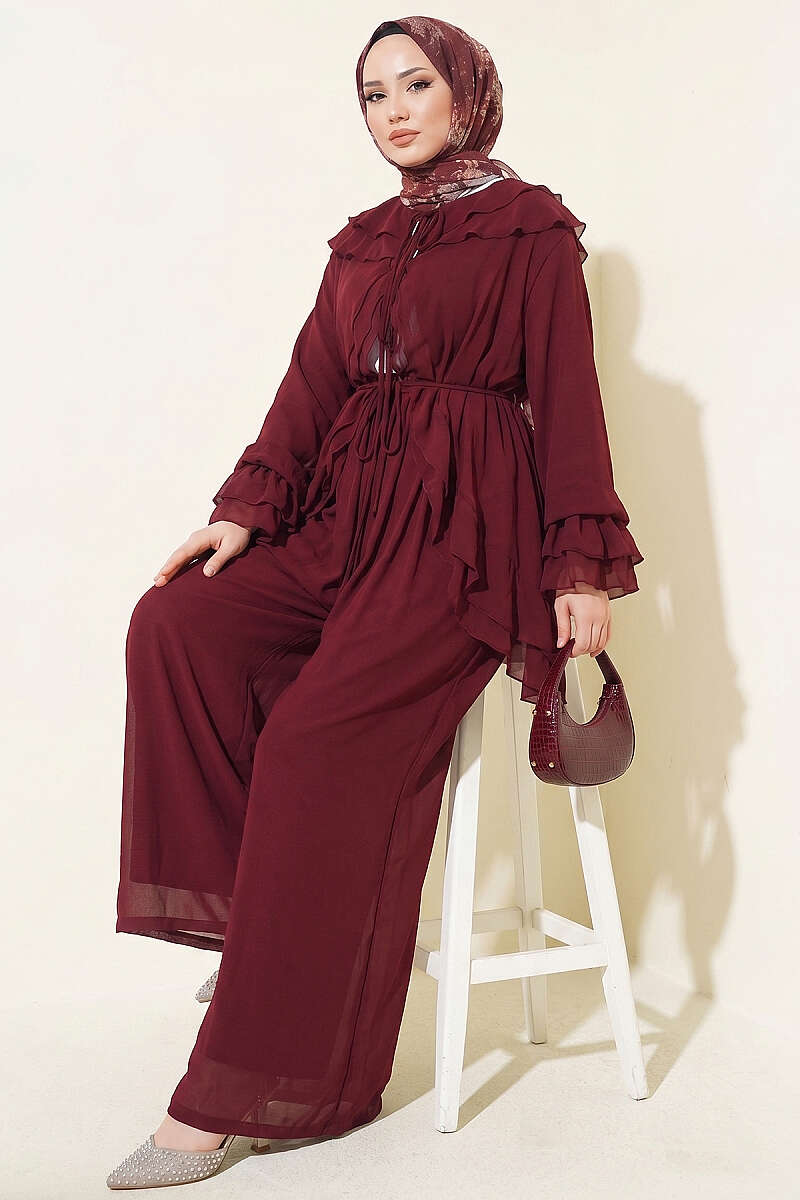 Fırfırlı İp Bağcıklı Şifon İkili Takım Mürdüm