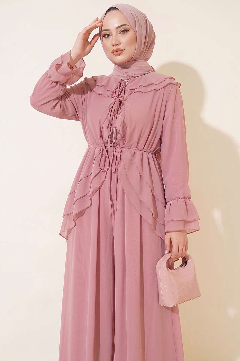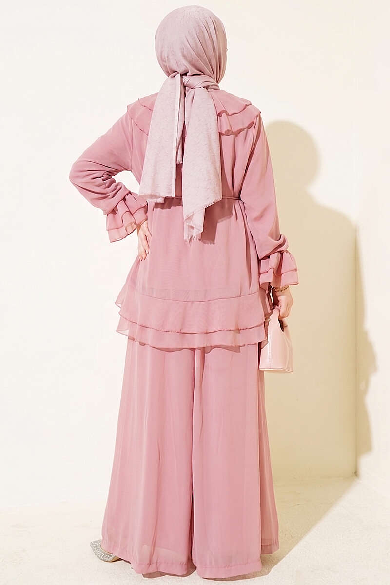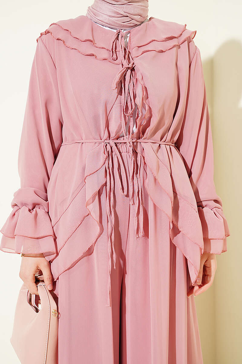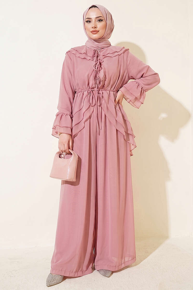 Fırfırlı İp Bağcıklı Şifon İkili Takım Pembe