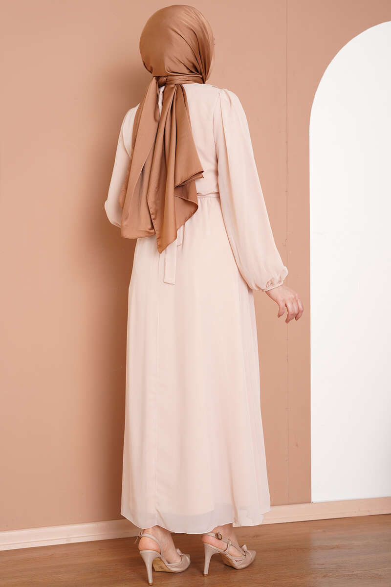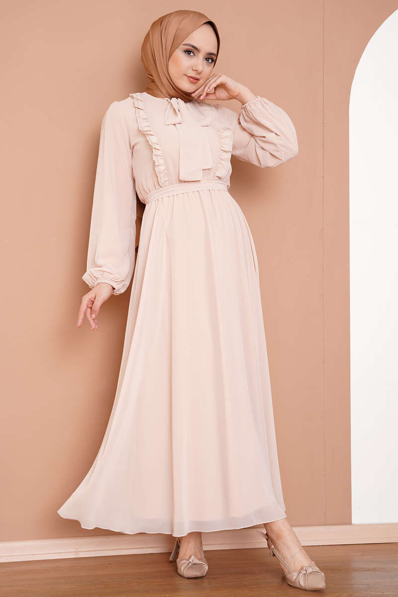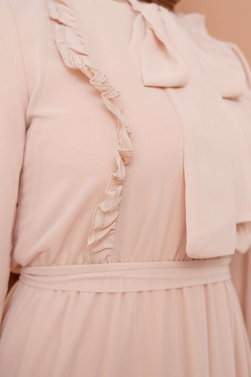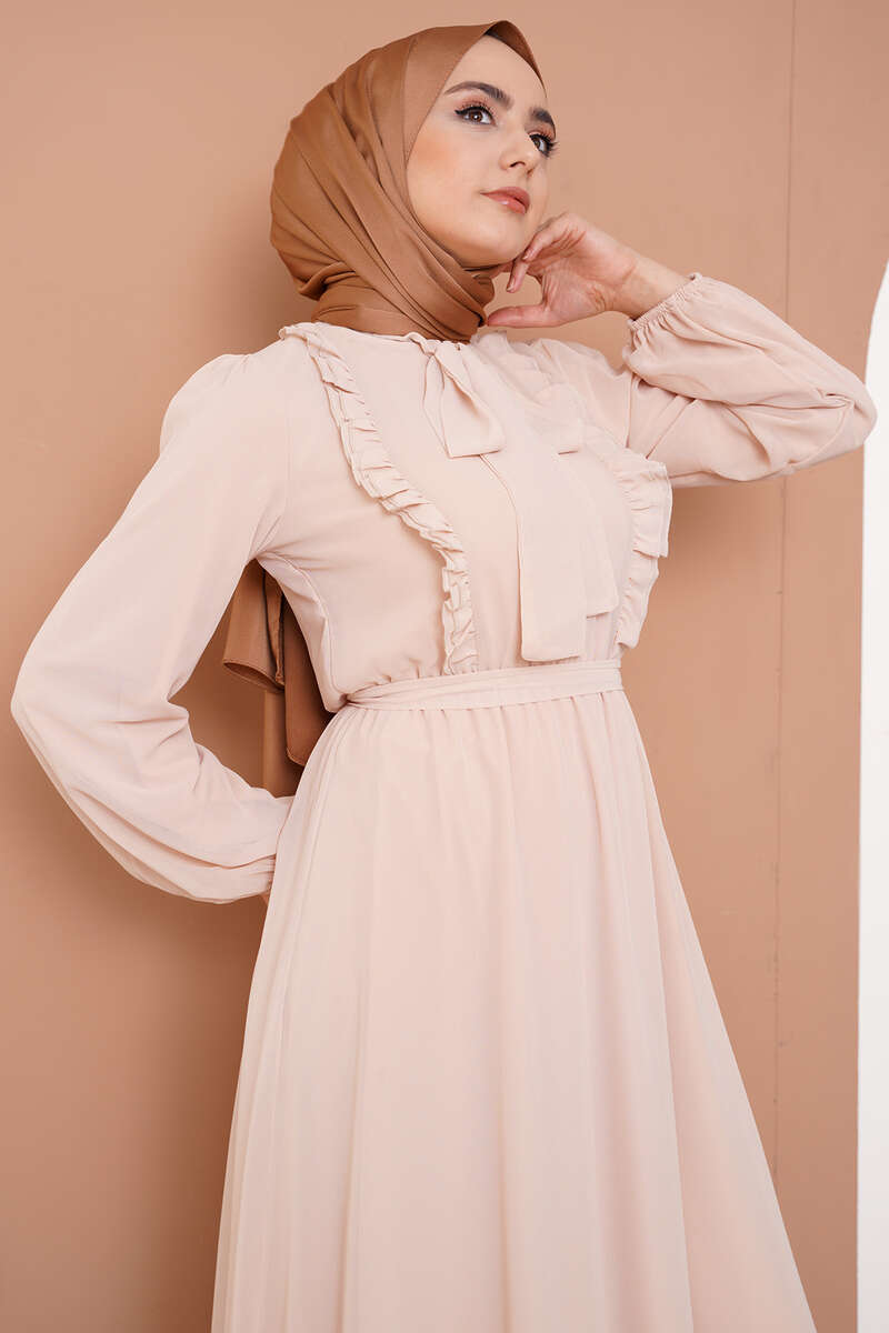 Fırfırlı Kuşaklı Şifon Elbise Bej
