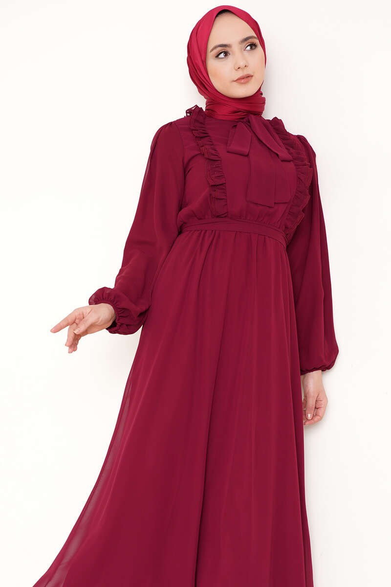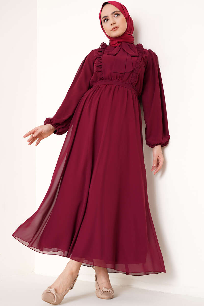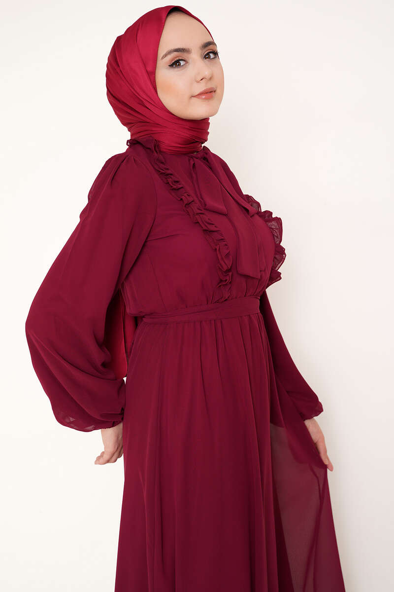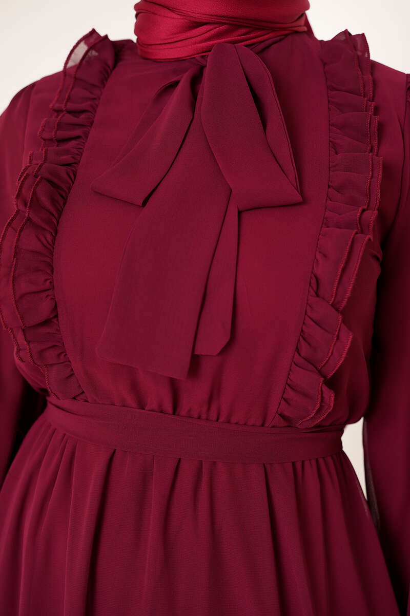 Fırfırlı Kuşaklı Şifon Elbise Bordo