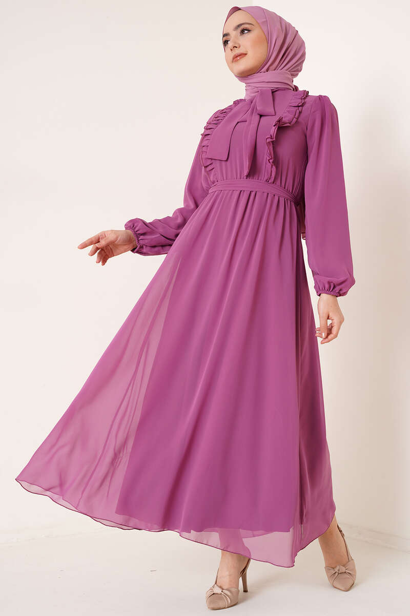 Yeni sezon şifon elbise kuşakldır. Önünde fırfır detayı bulunan elbisemizin yakası fular bağlamalıdır. Ense düğmesi bulunan elbisemizin beli ve bilekleri lastiklidir. Şifon elbisemizin içi astarlıdır.