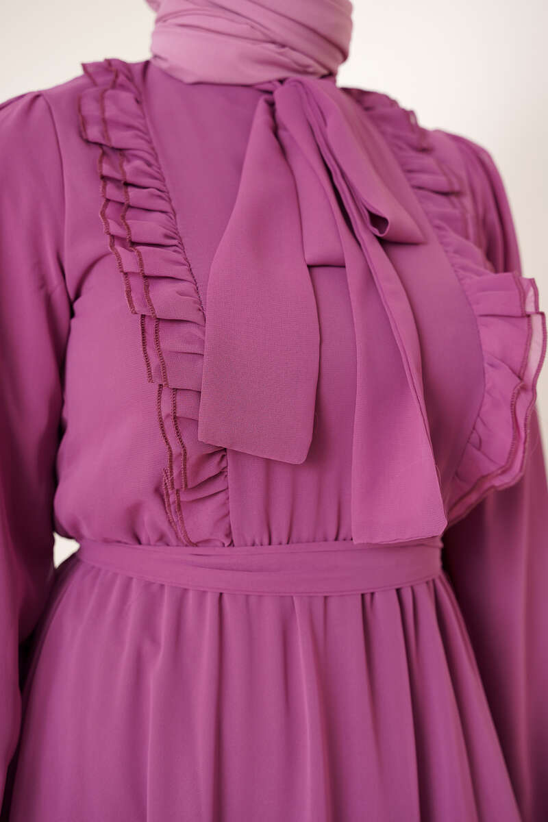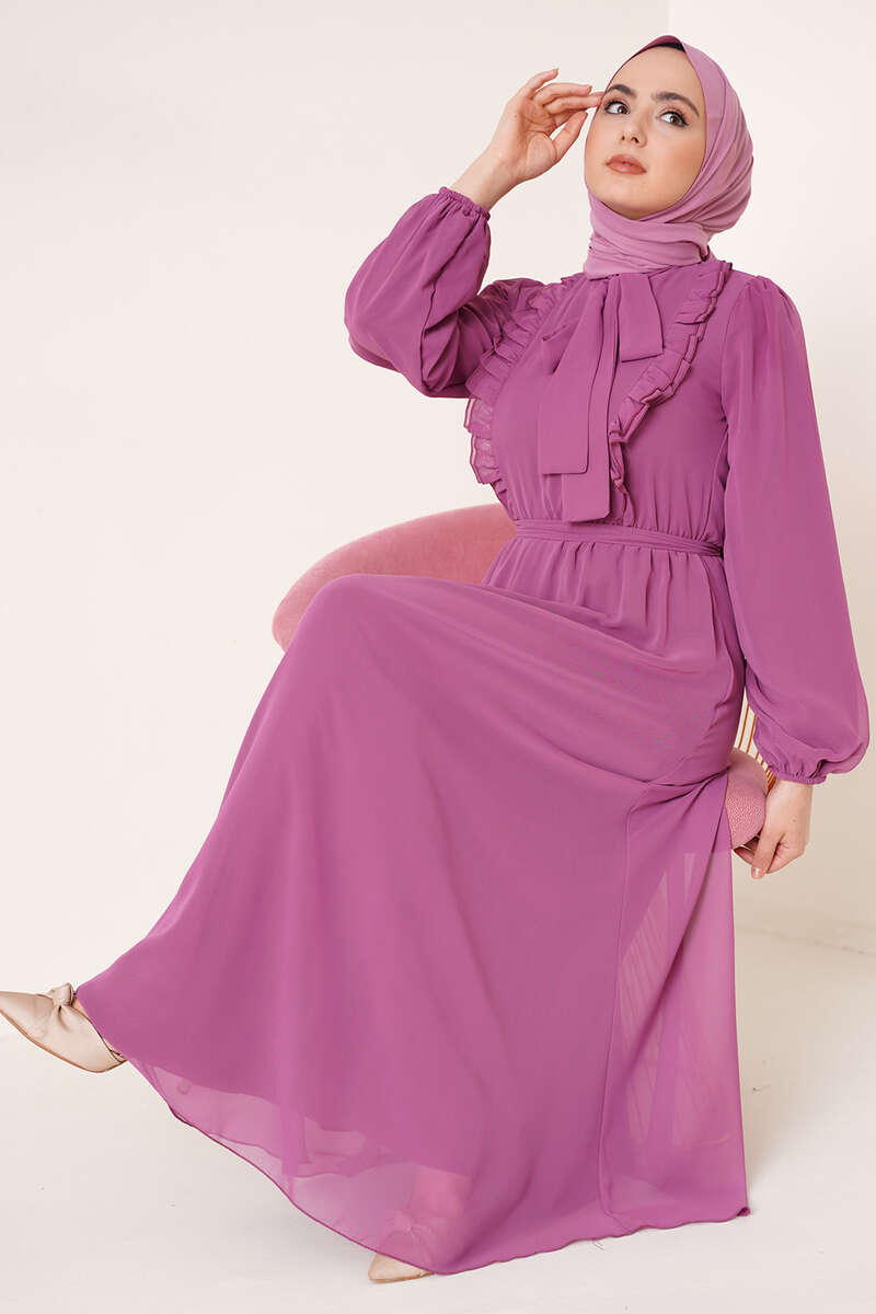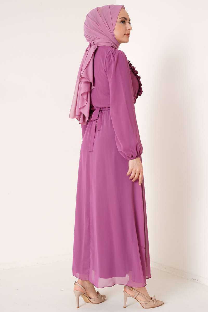 Fırfırlı Kuşaklı Şifon Elbise Gül Kurusu