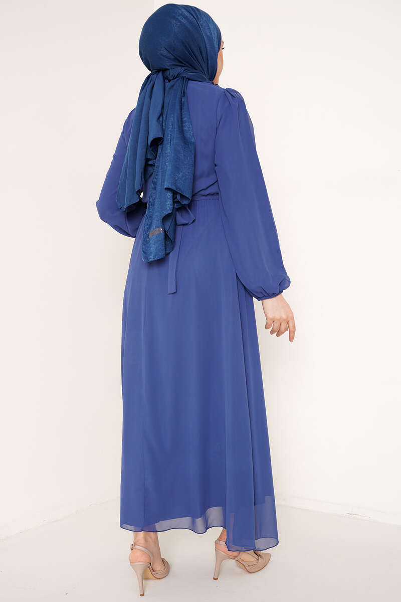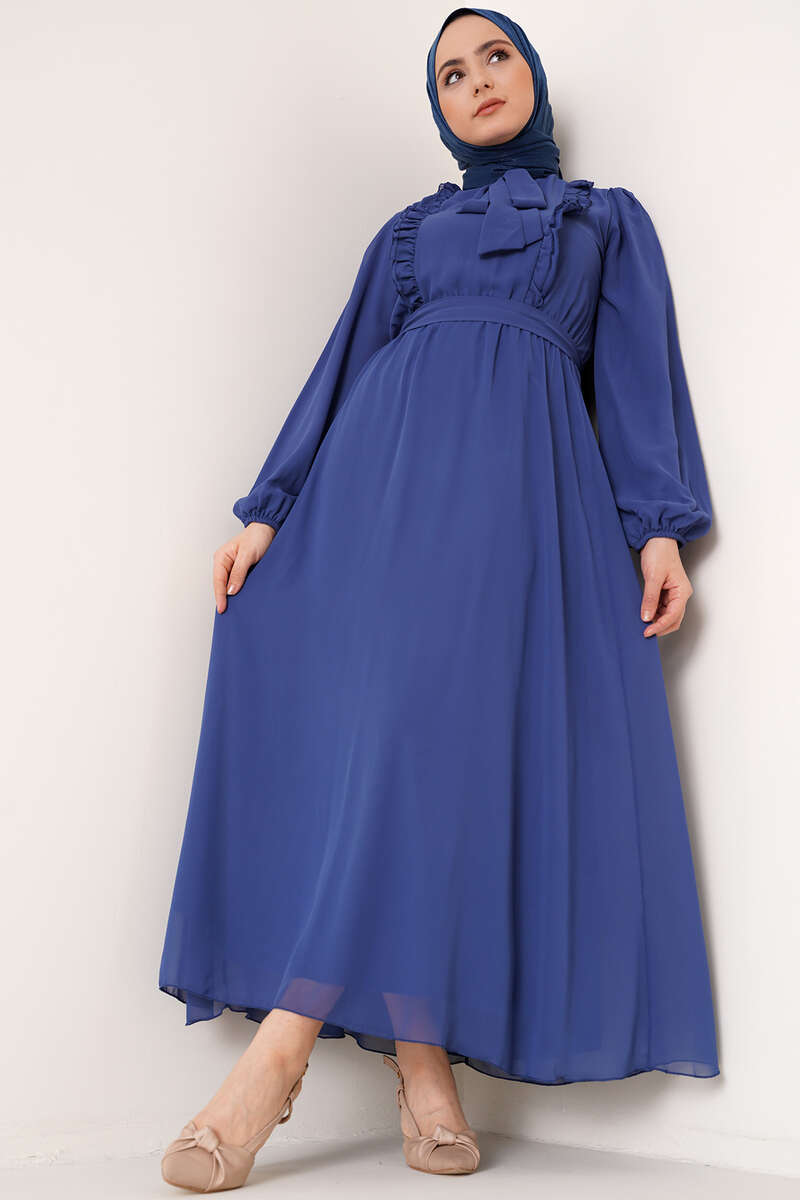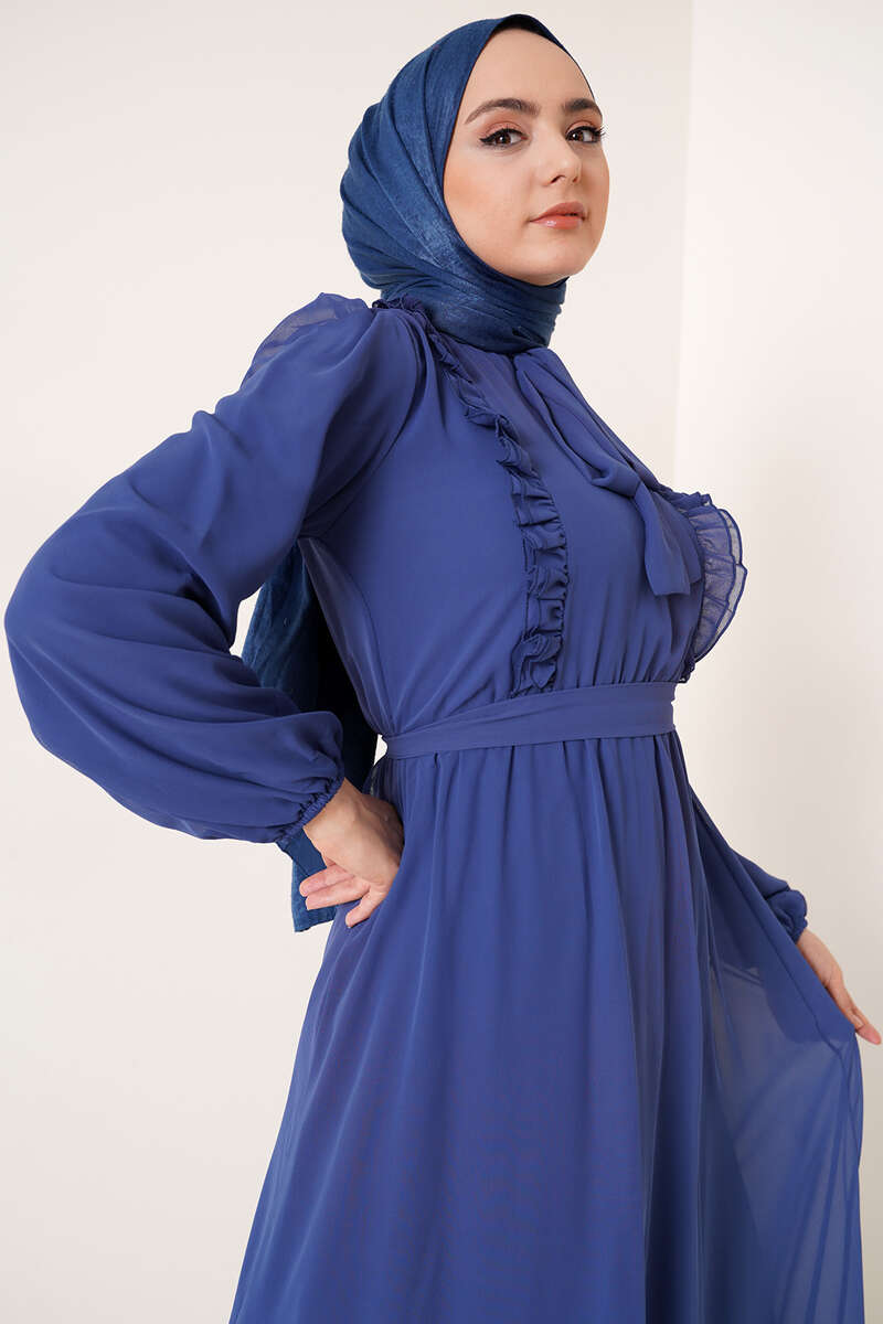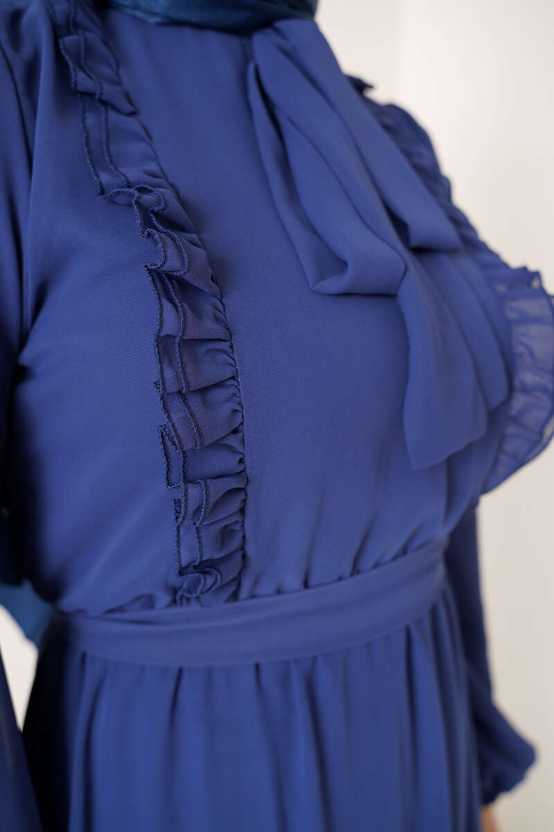 Fırfırlı Kuşaklı Şifon Elbise İndigo