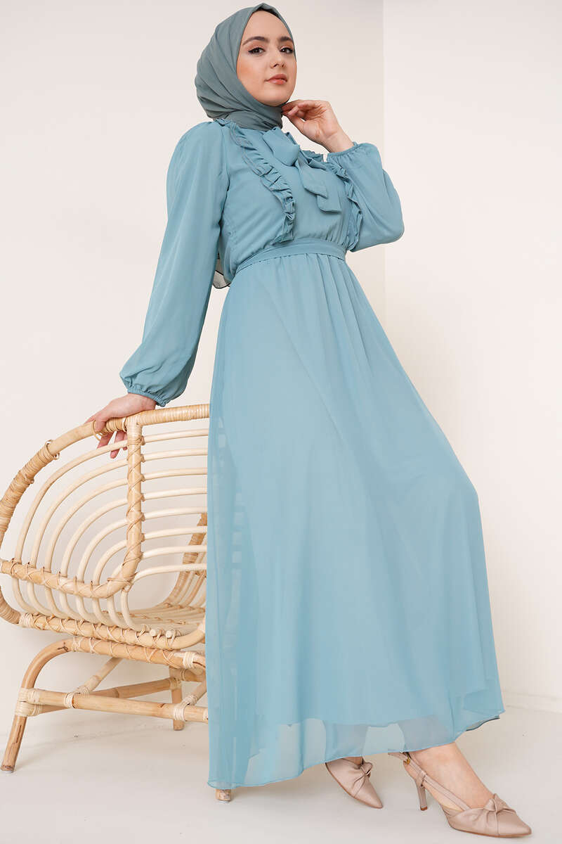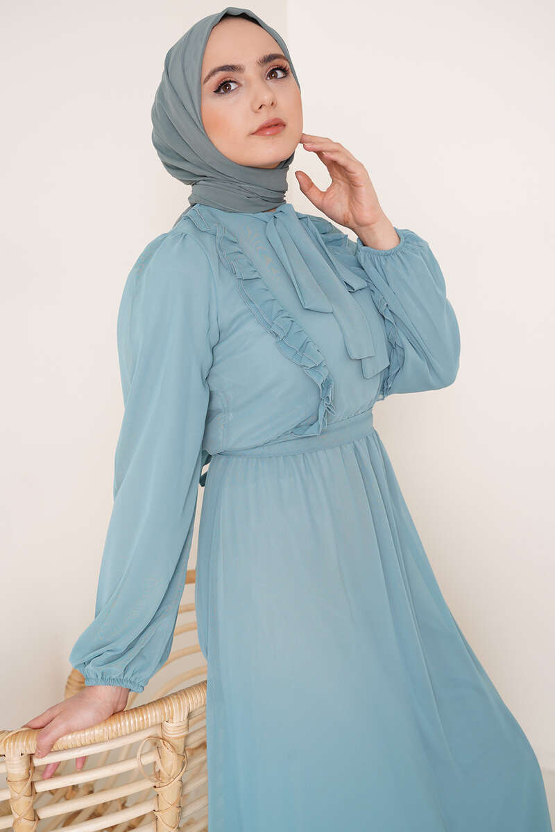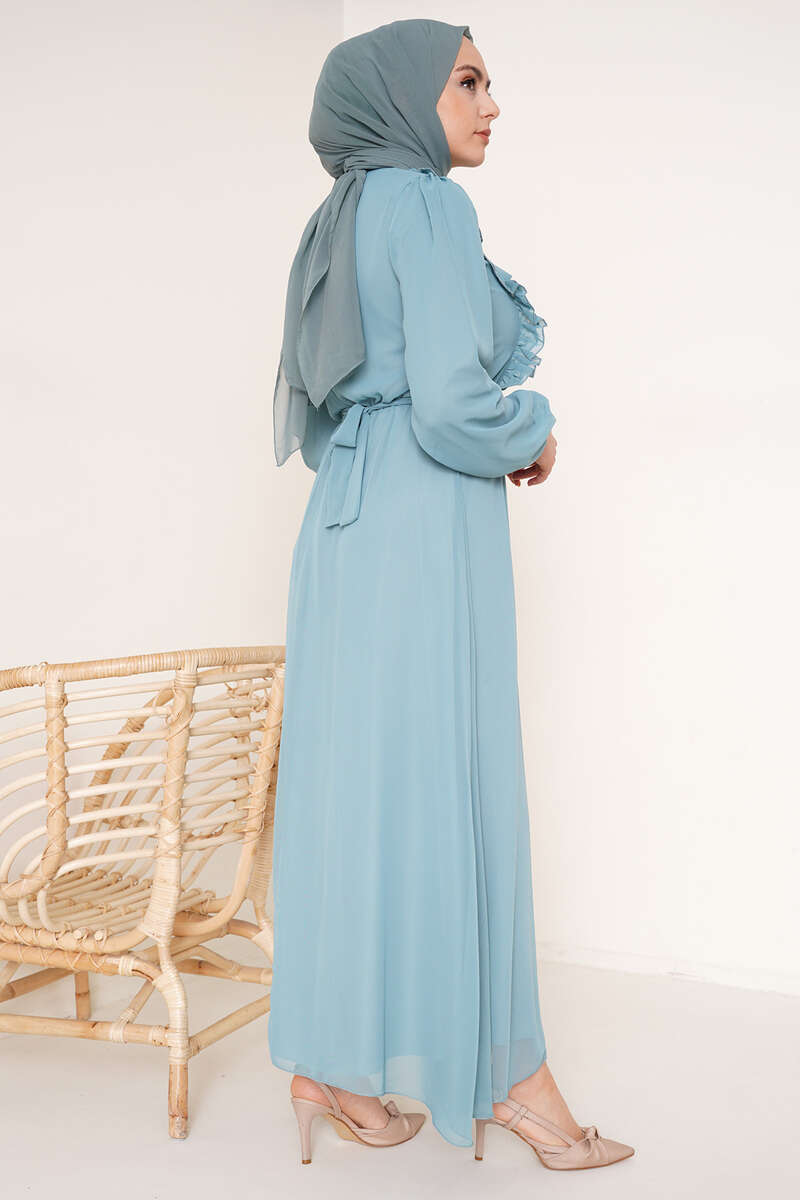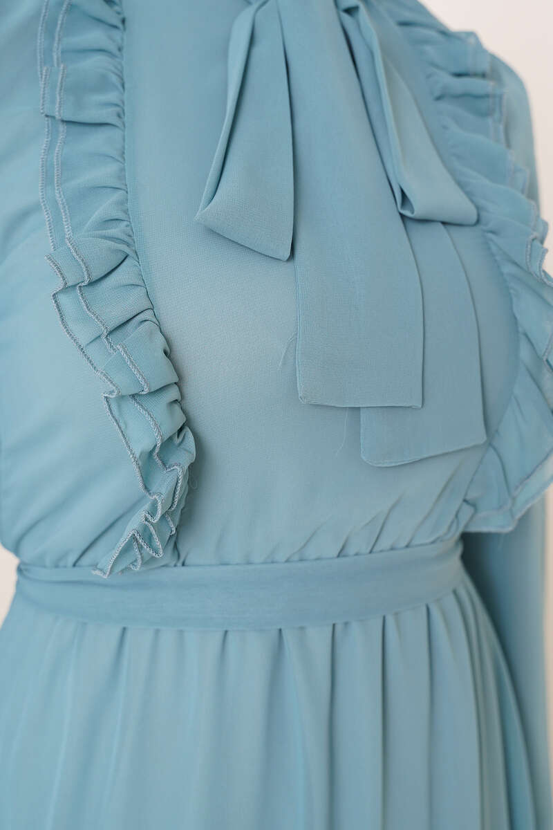 Fırfırlı Kuşaklı Şifon Elbise Mint Yeşili
