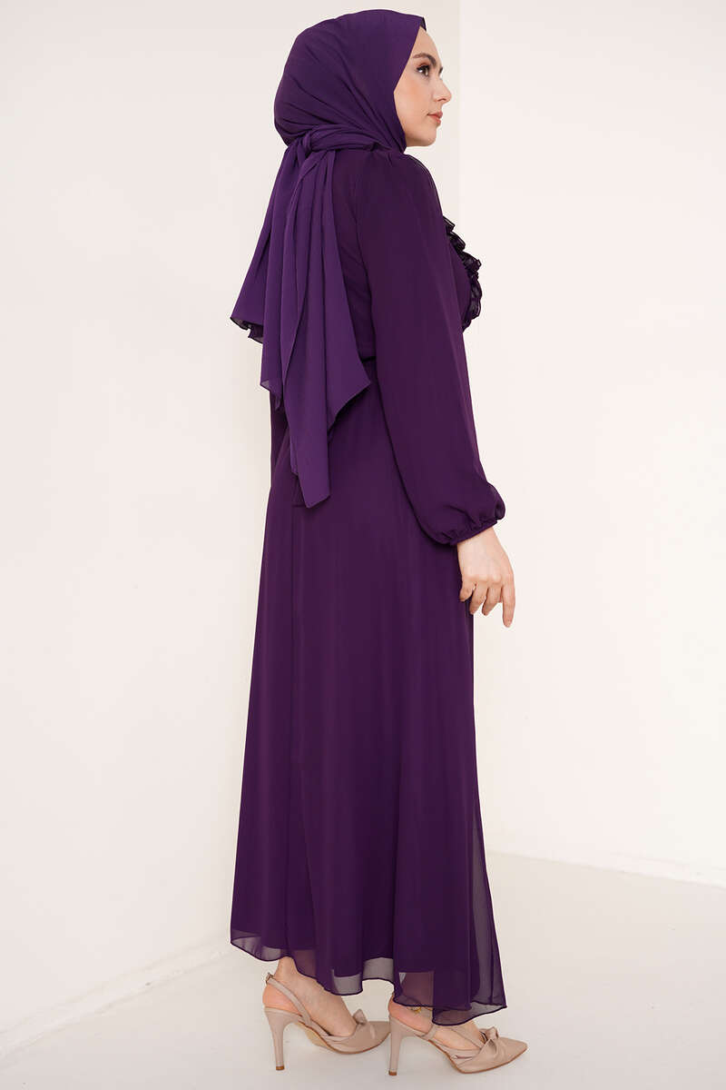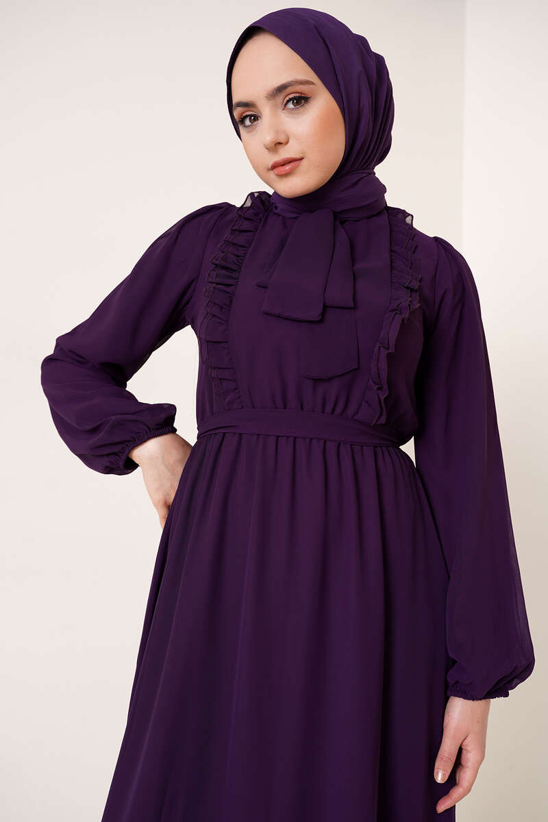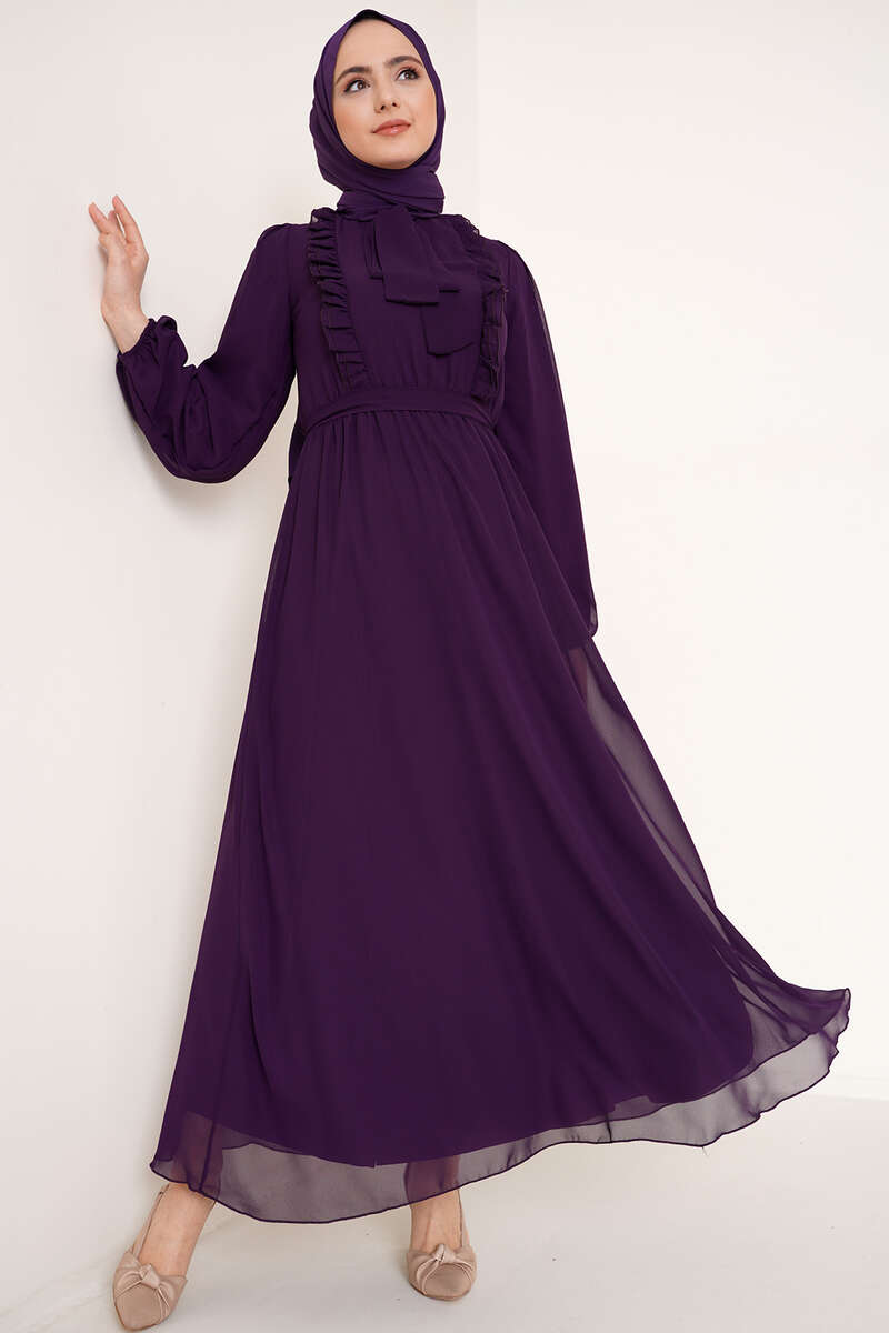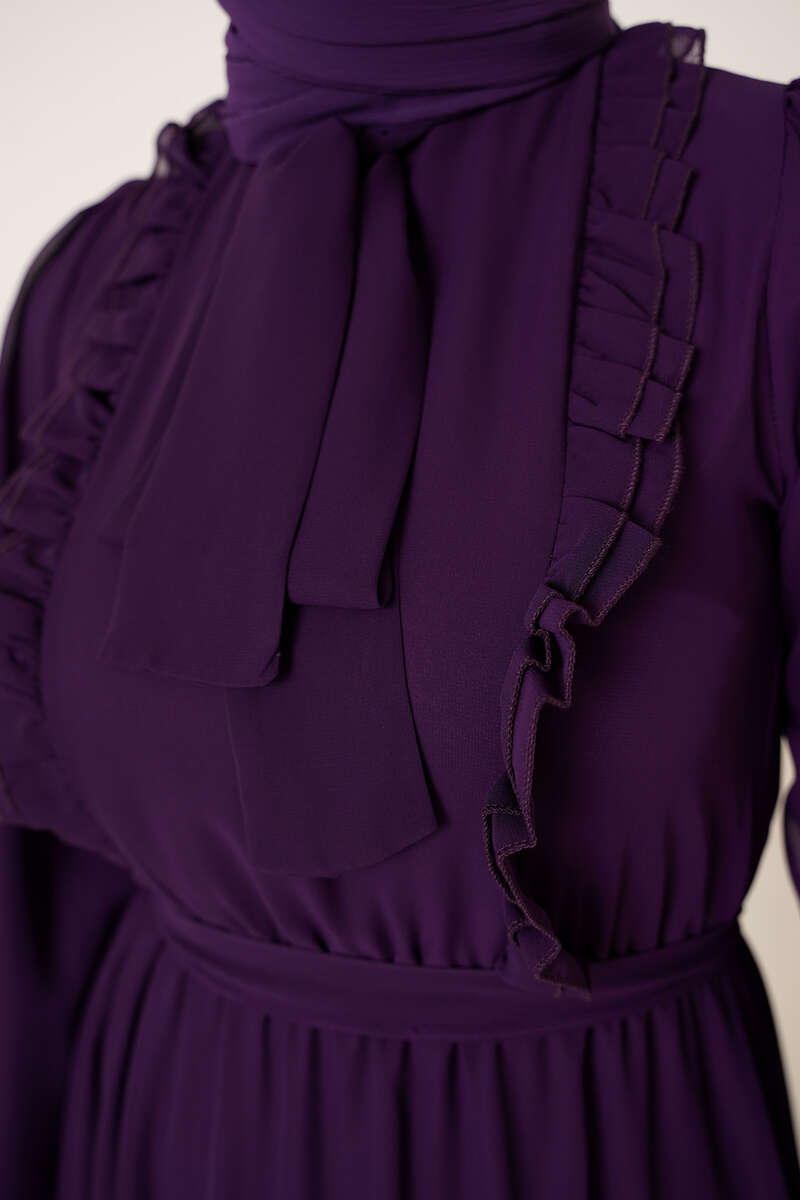 Fırfırlı Kuşaklı Şifon Elbise Mor
