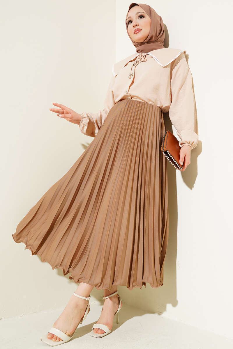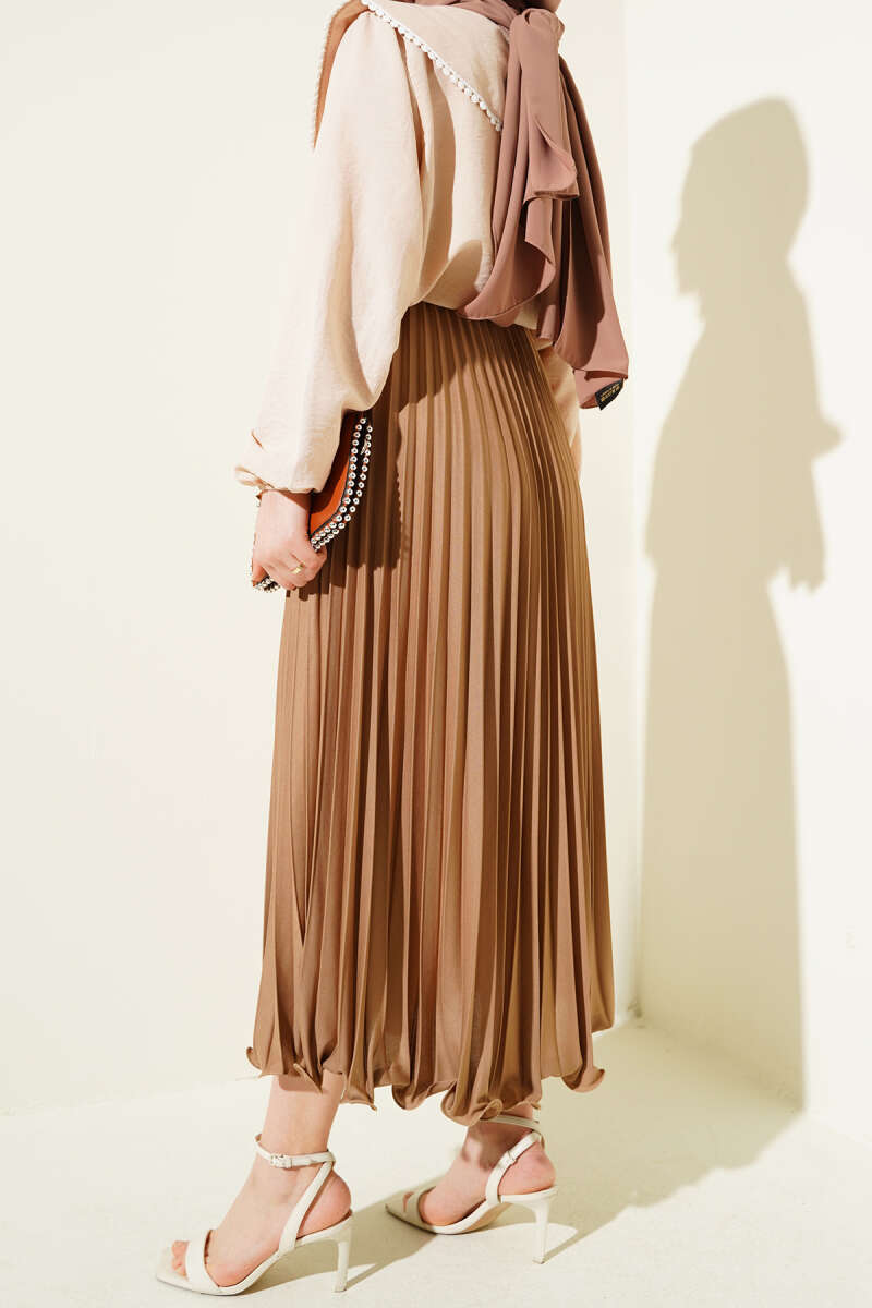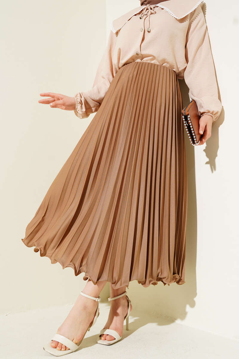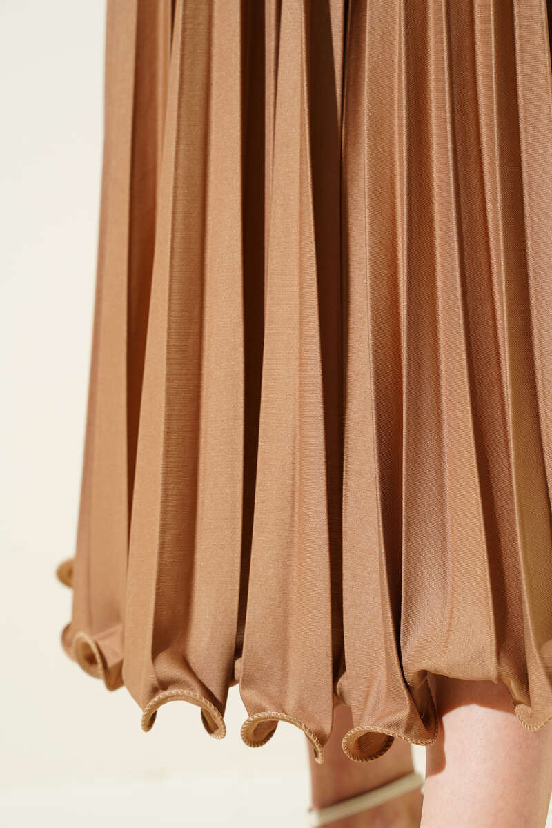 Fırfırlı Pileli Bel Lastikli Etek Acı Kahve