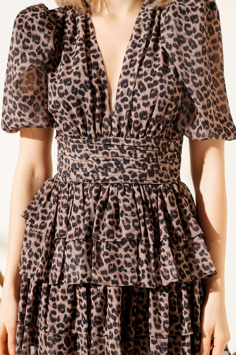 Fırfırlı V Yaka Mini Şifon Elbise Leopar