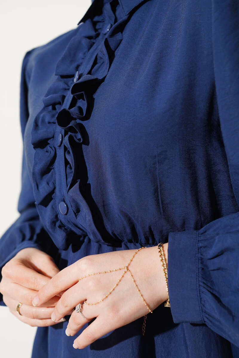Düğmeli Tensel İnce Kemerli Elbise Lacivert