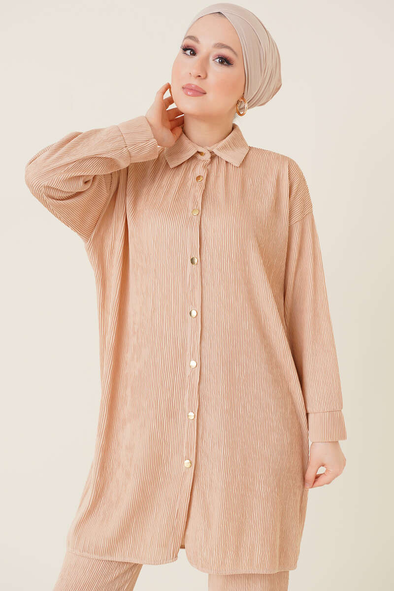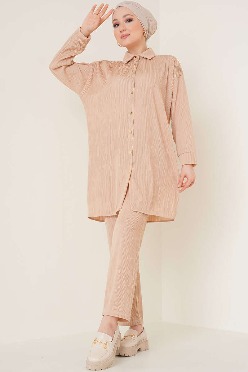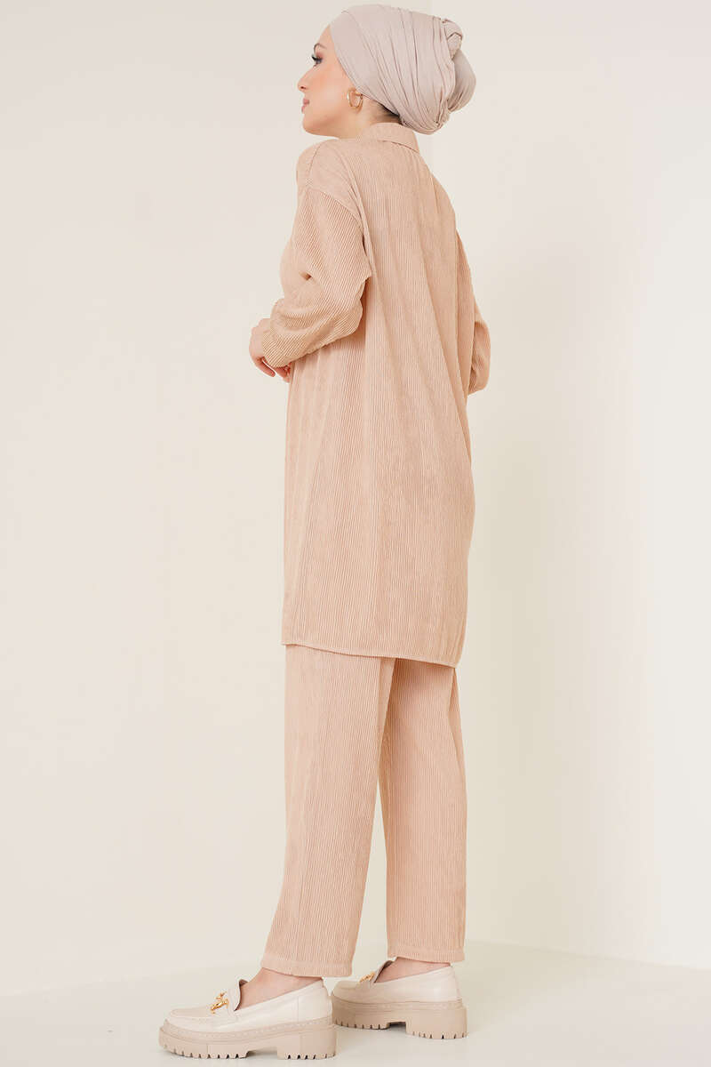 Yeni sezon ikili takımımız dikkat çeken tasarımıyla sizler için geldi. Takımımız fitilli kumaştan yapılmıştır. Oldukça şık yapıdadır. Gömleğimizin önü düğmelidir. Uzun yapıdadır. Pantolon beli lastikli cepsiz modeldir. Sportif ve rahattır. Her ortamda rahatlıkla giyebilirsiniz. Farklı renk seçenekleri mevcuttur.