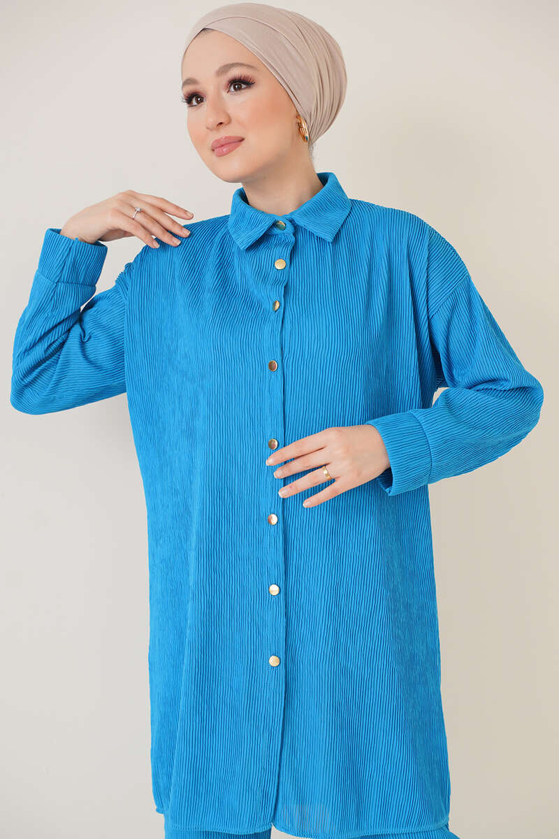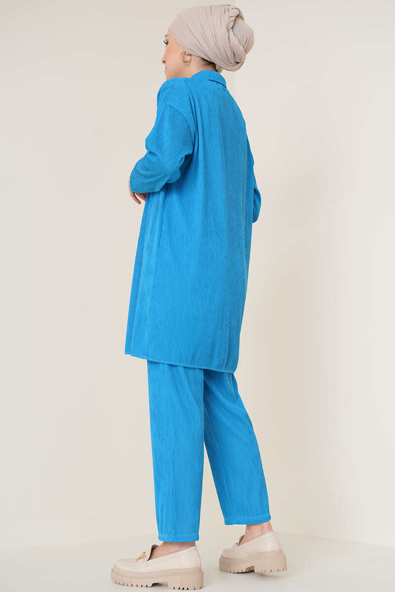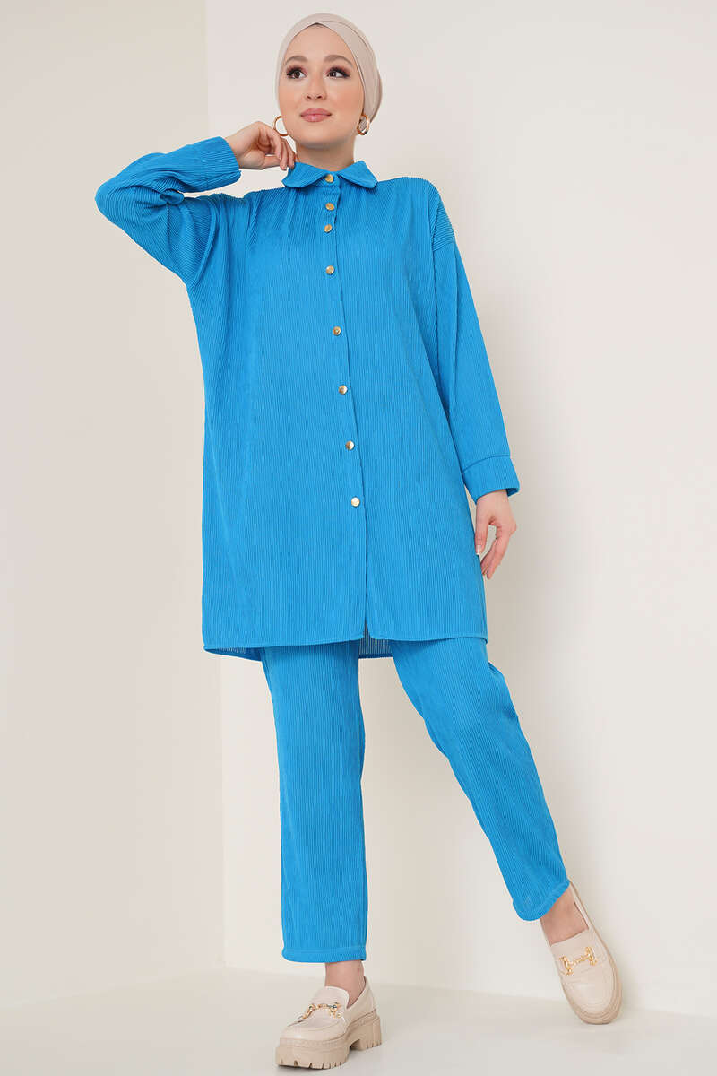 Yeni sezon ikili takımımız dikkat çeken tasarımıyla sizler için geldi. Takımımız fitilli kumaştan yapılmıştır. Oldukça şık yapıdadır. Gömleğimizin önü düğmelidir. Uzun yapıdadır. Pantolon beli lastikli cepsiz modeldir. Sportif ve rahattır. Her ortamda rahatlıkla giyebilirsiniz. Farklı renk seçenekleri mevcuttur.