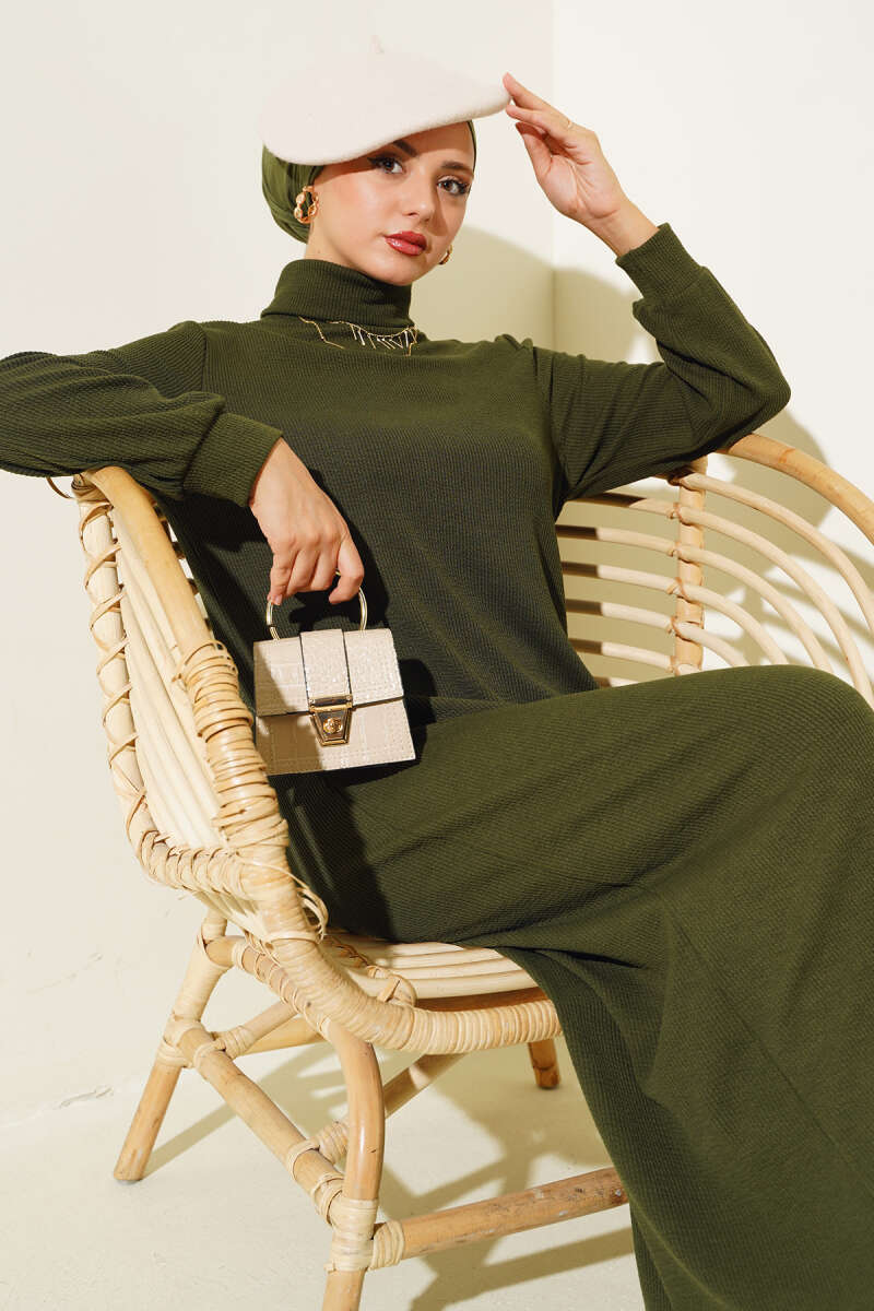 Yakası Yarım Fermuarlı Triko Elbise Yağ Yeşili