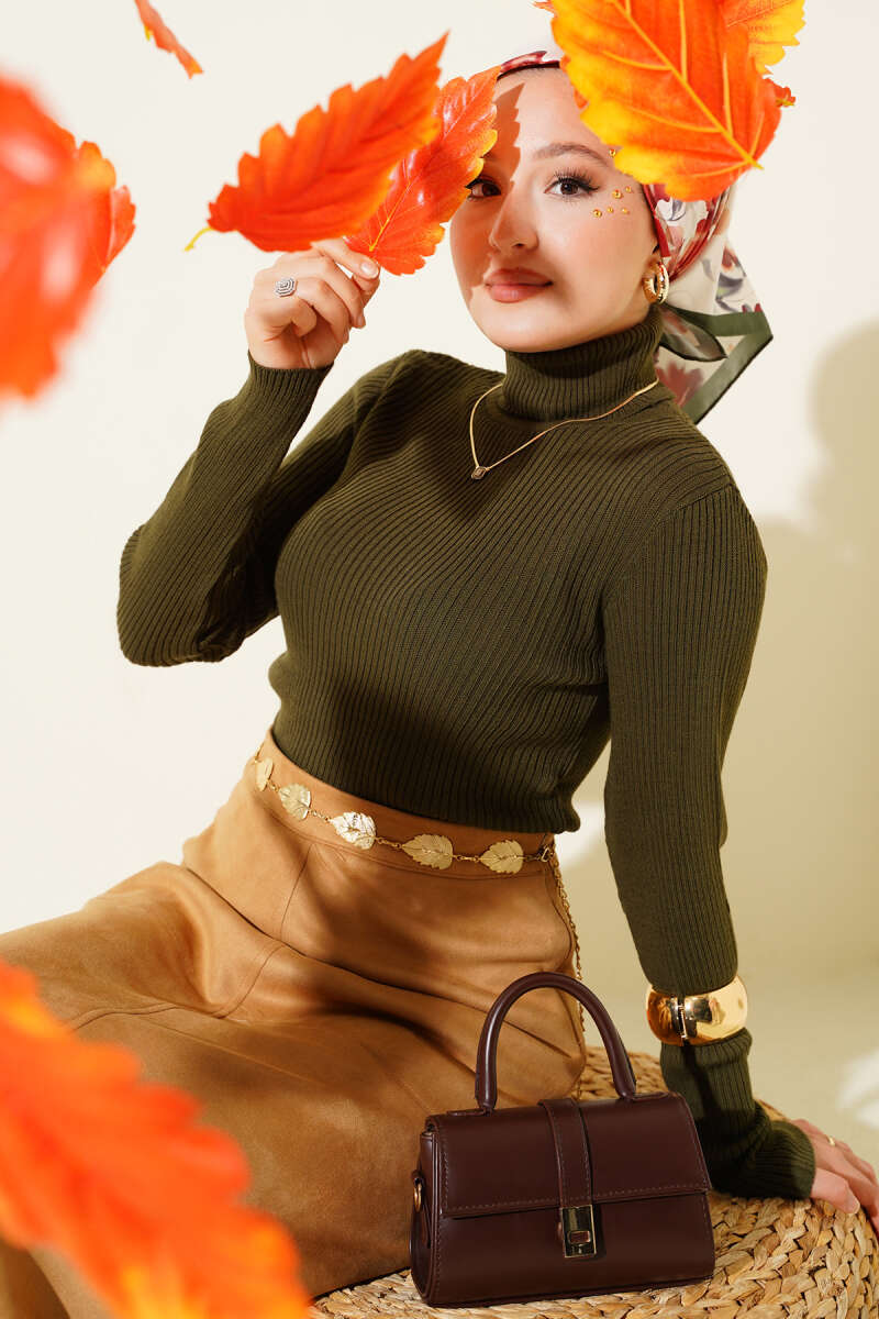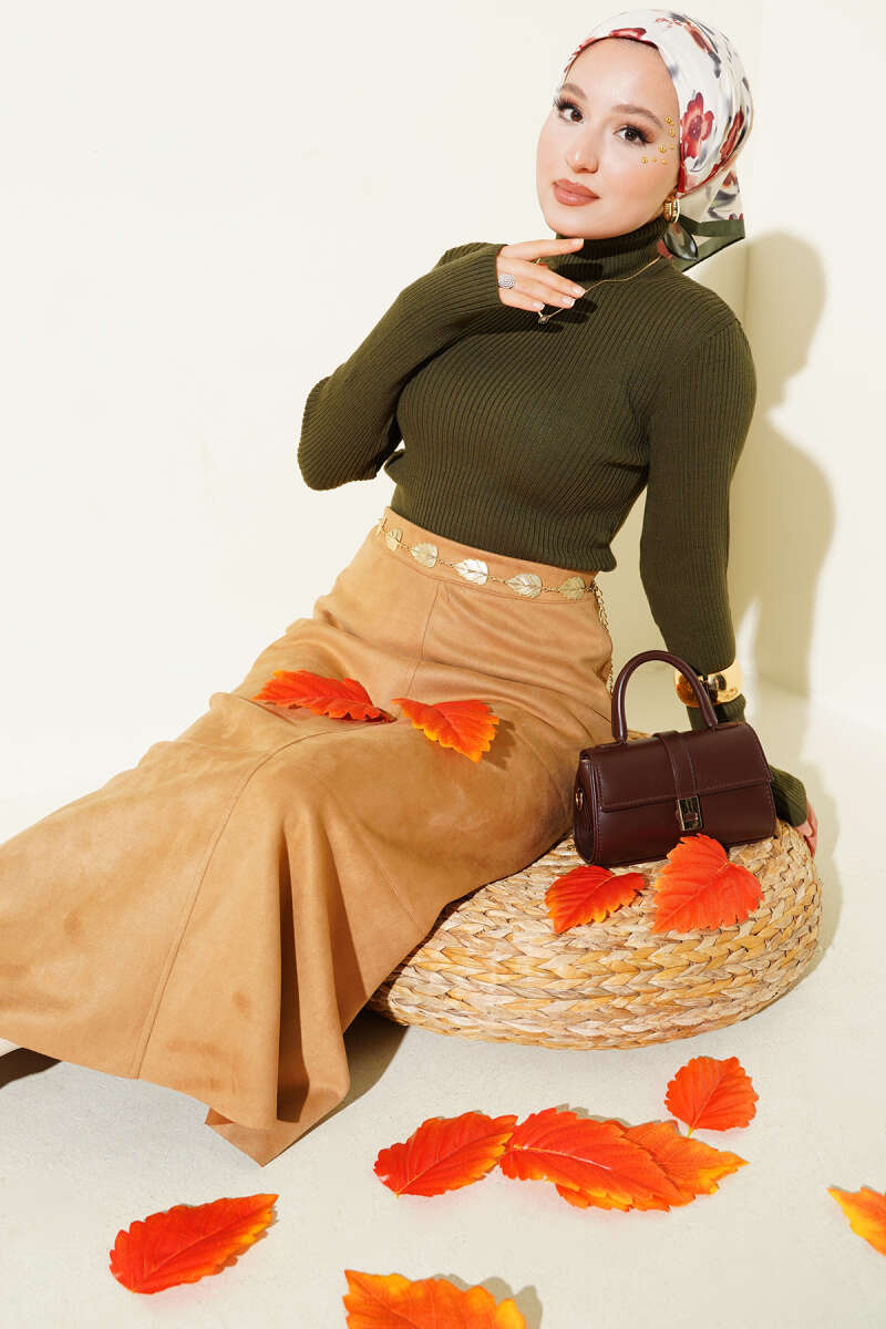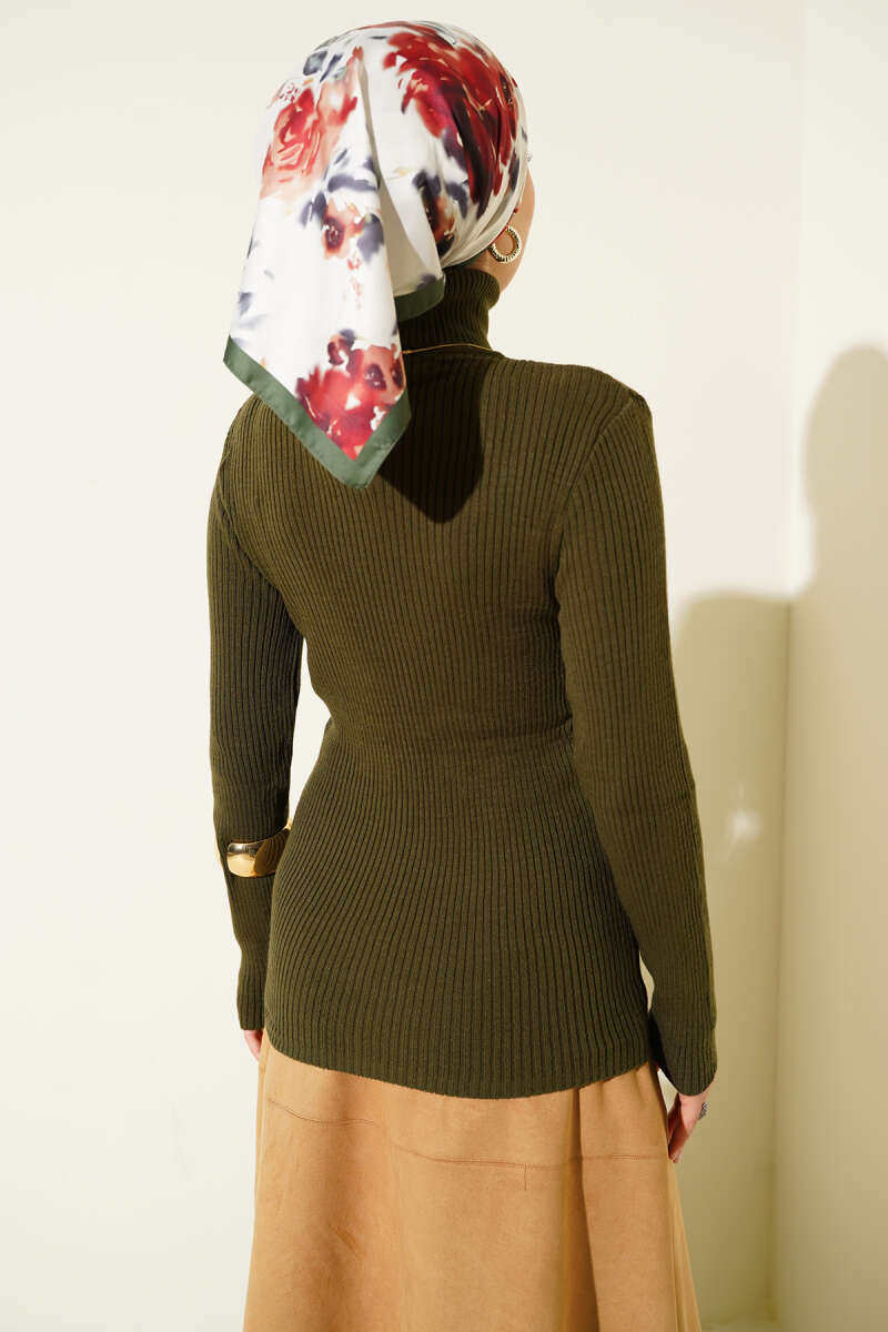 Fitilli Balıkçı Yaka Triko Kazak Haki