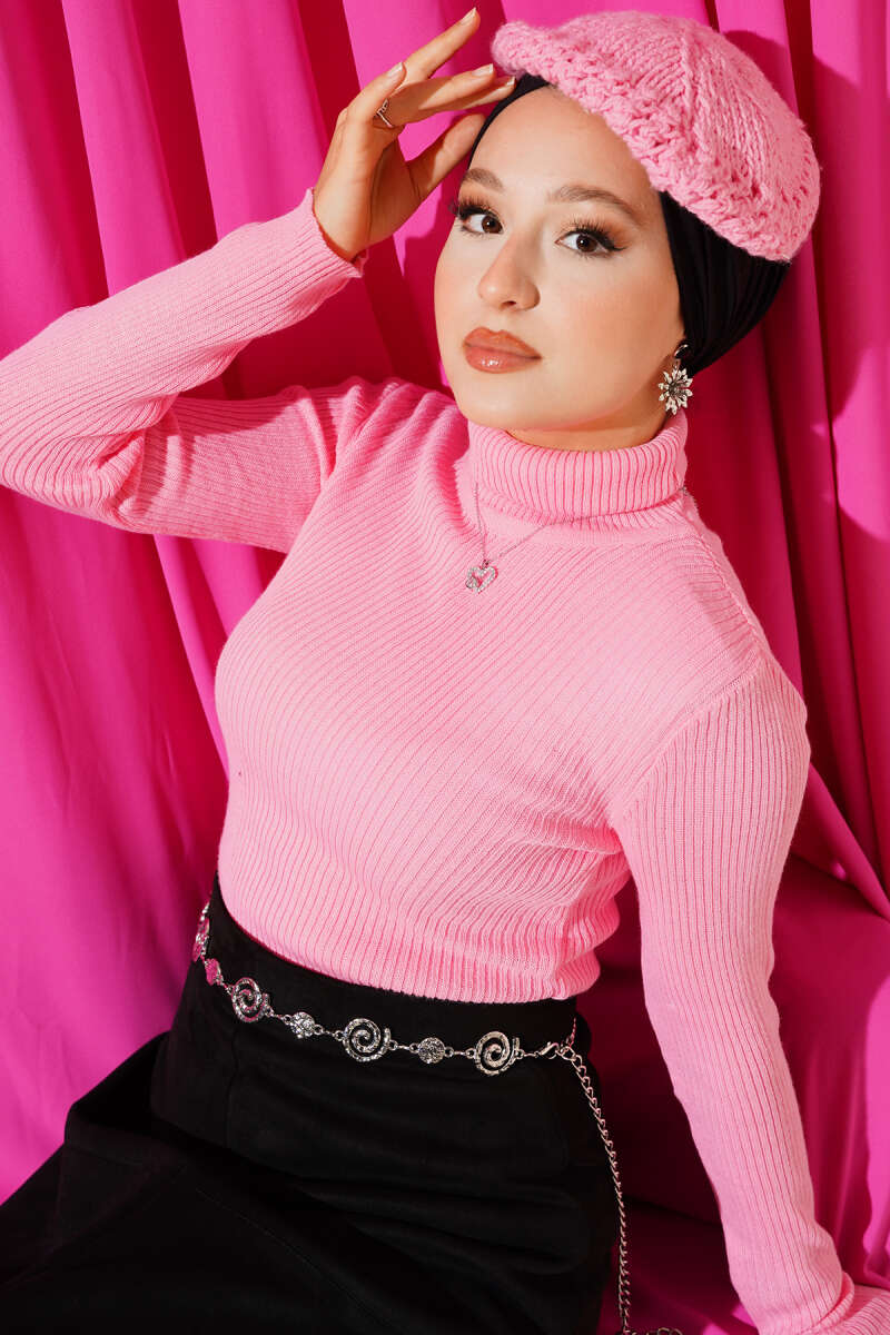 Fitilli Balıkçı Yaka Triko Kazak Pembe
