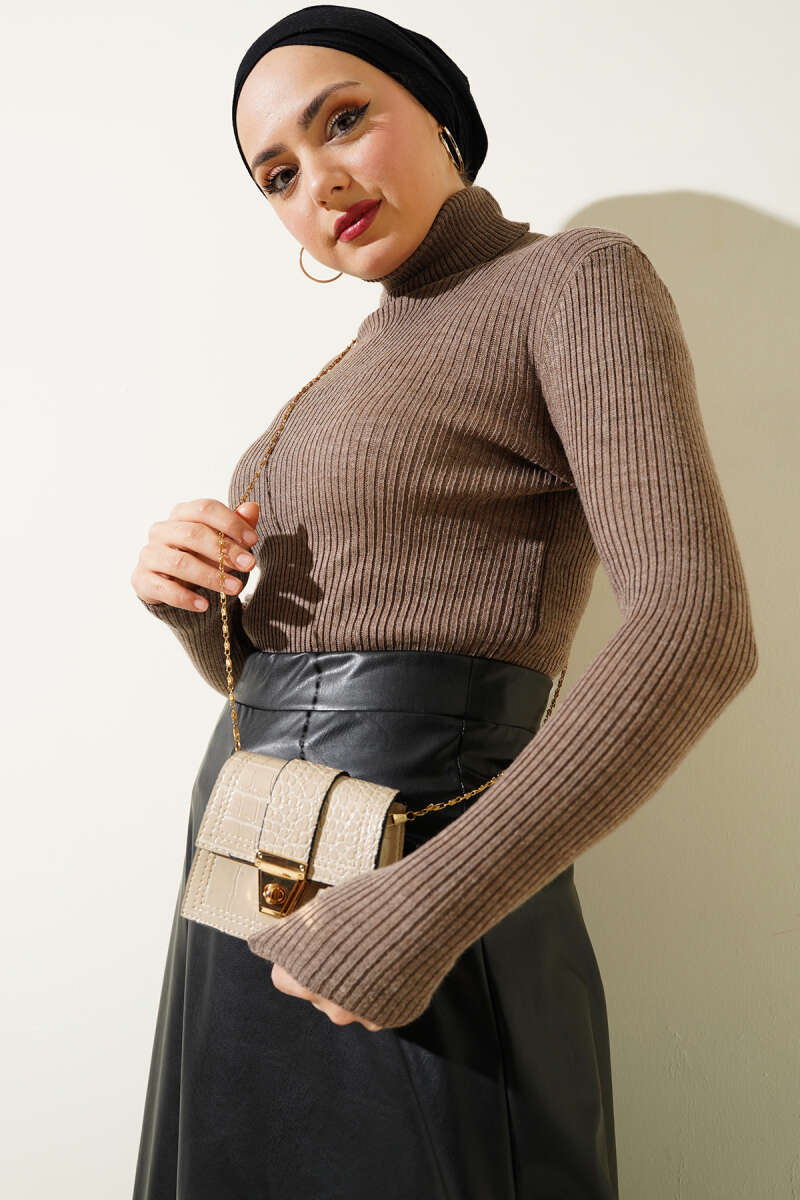 Bisiklet Yaka Sakal Detaylı Kazak Latte