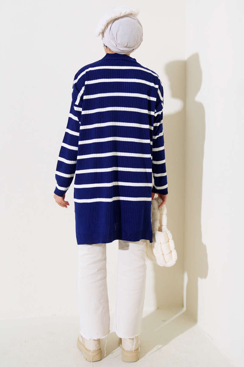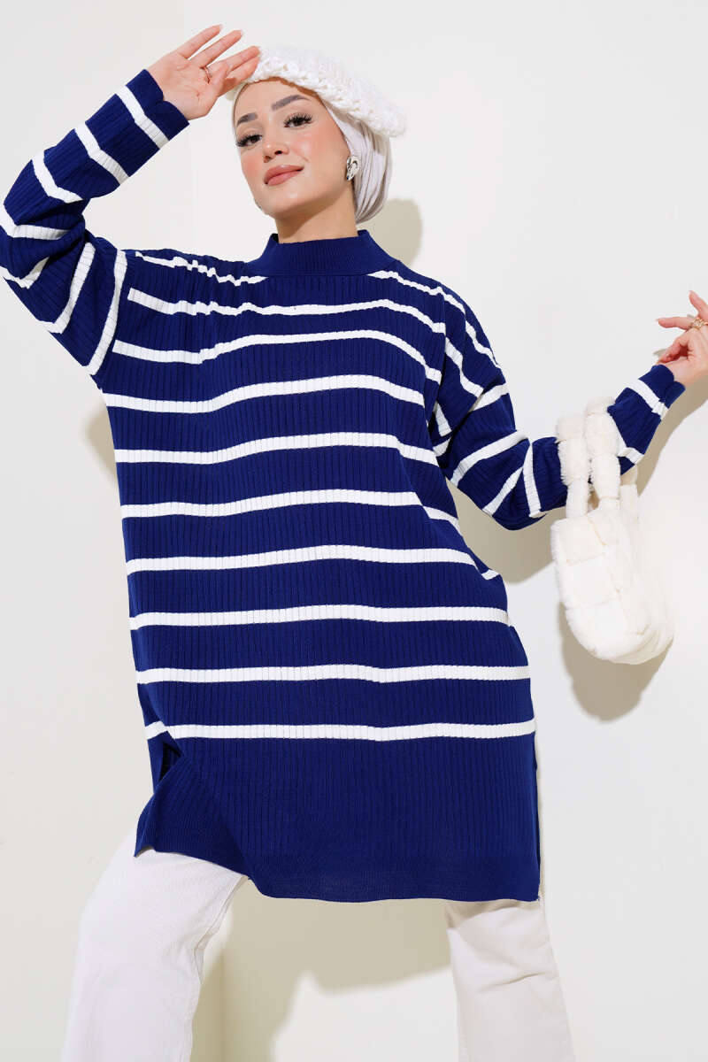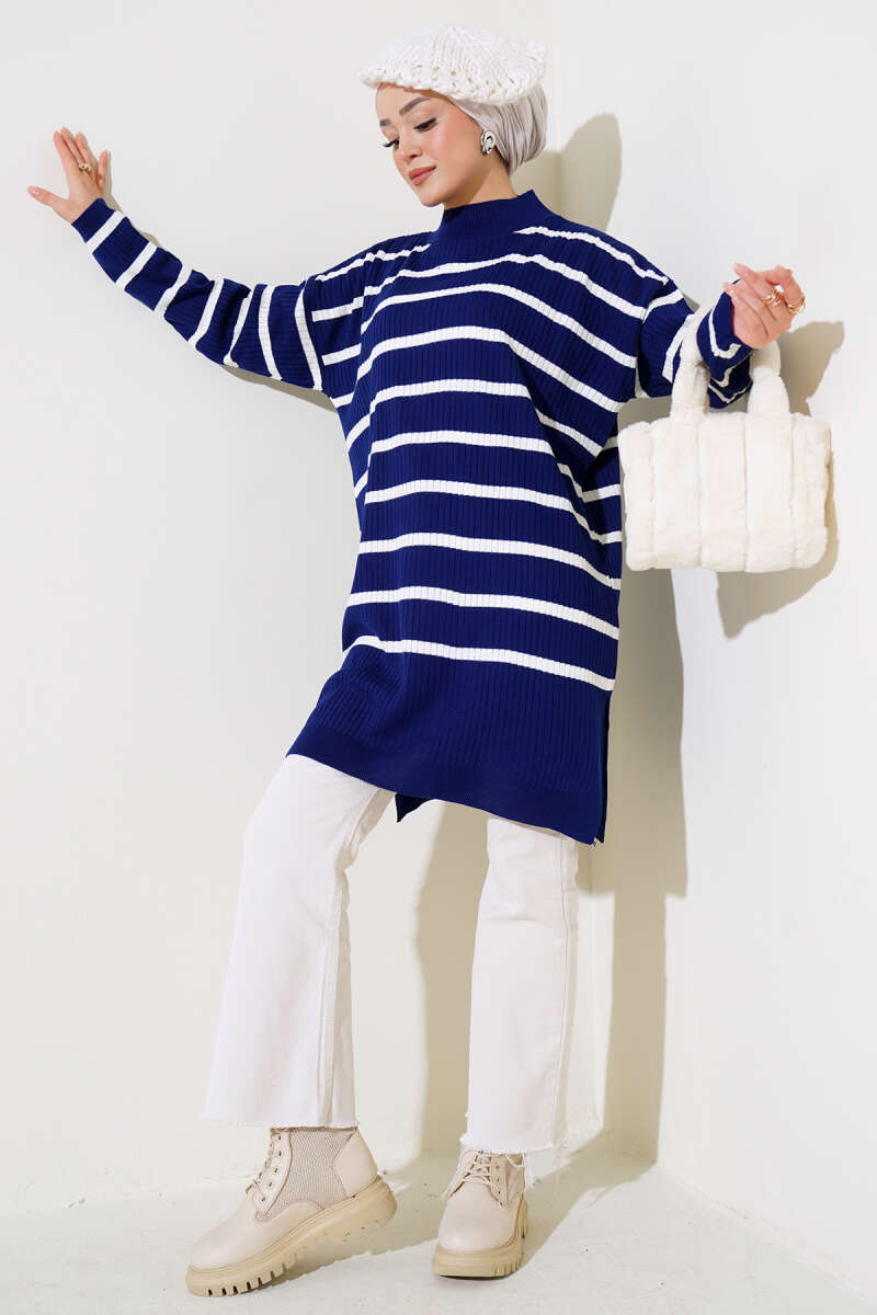 Fitilli Çizgili Salaş Triko Tunik Lacivert