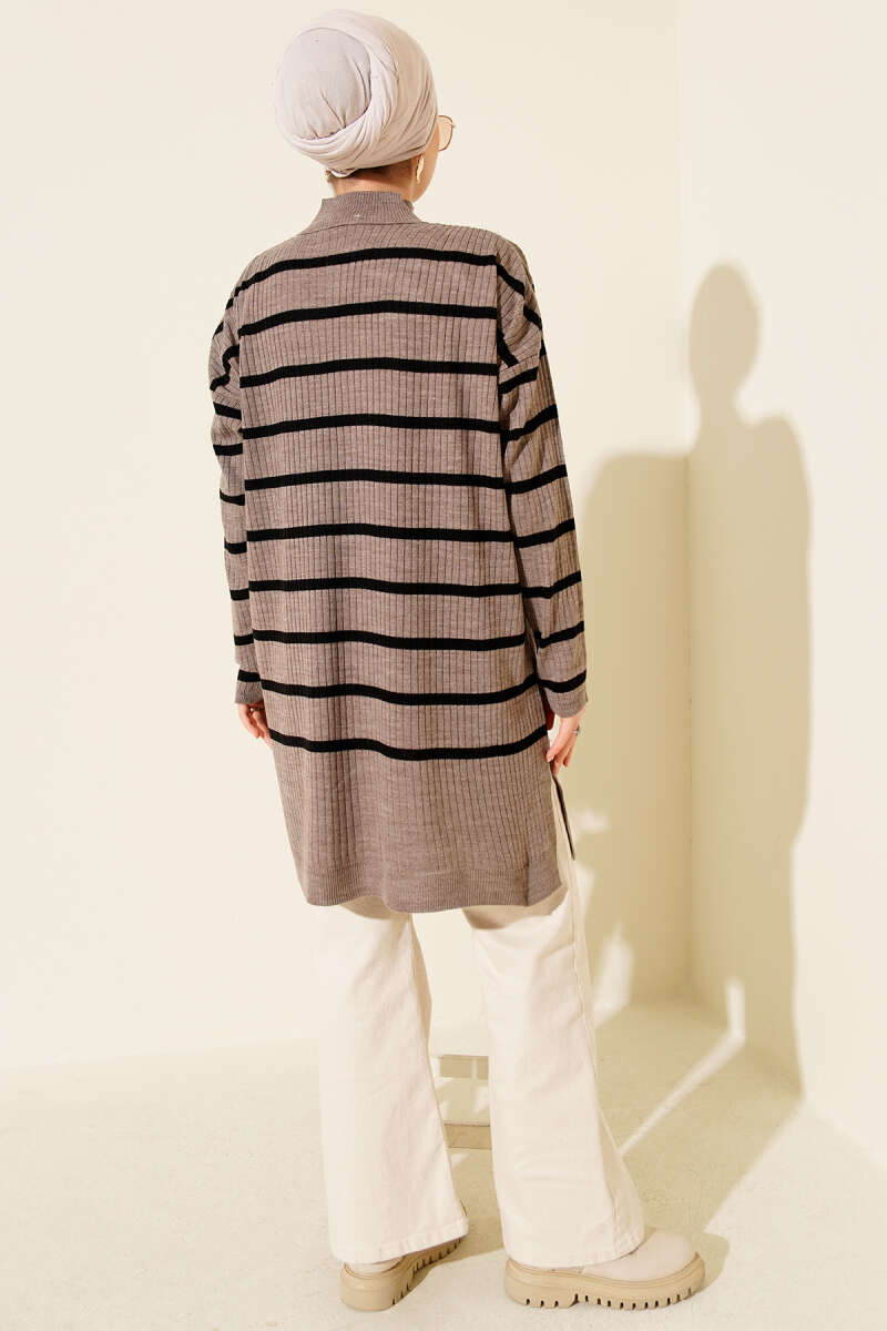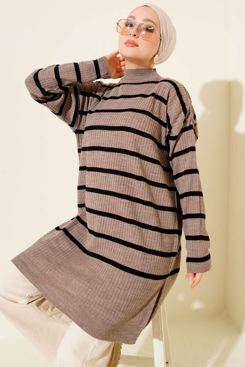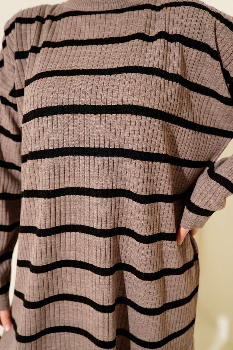 Yatay Kalın Çizgili Triko Tunik Bej