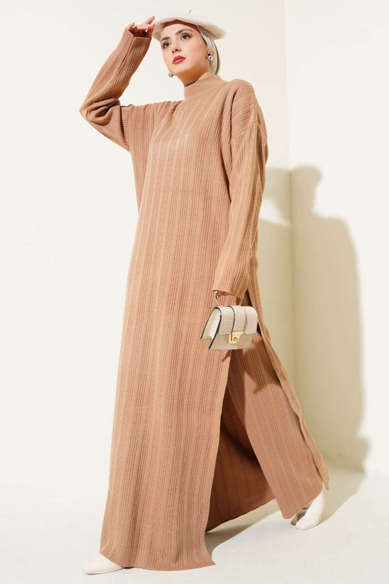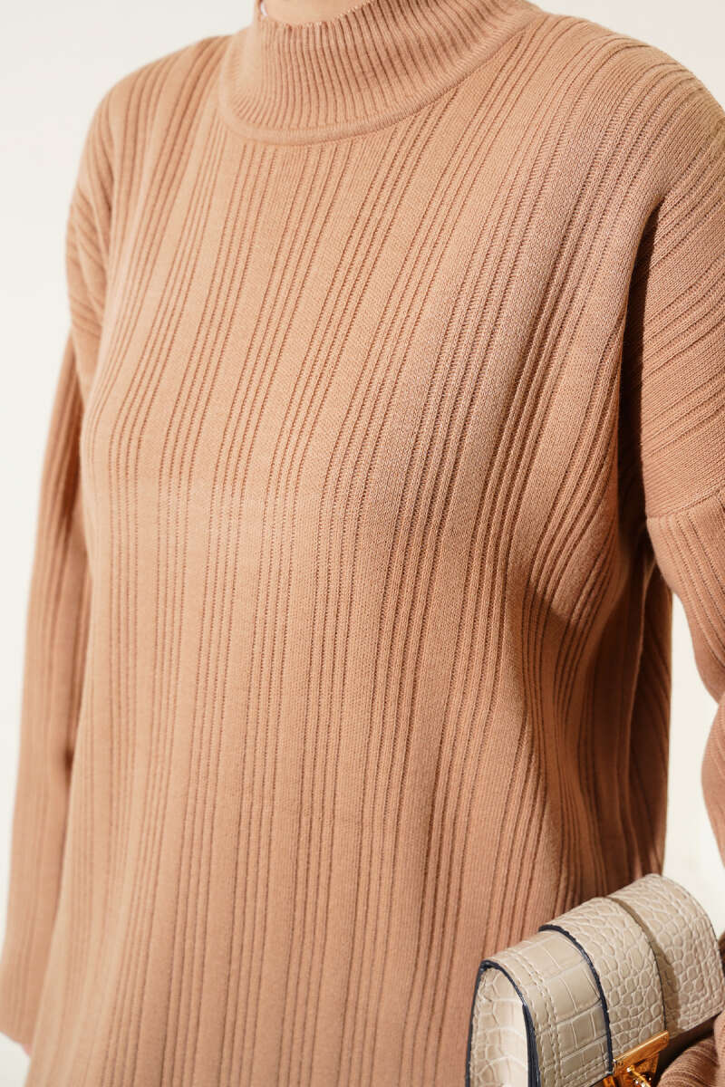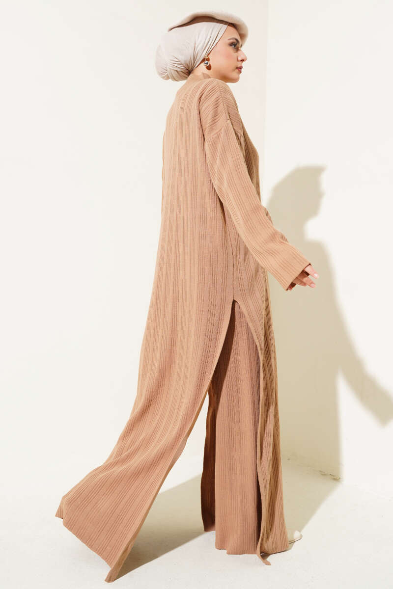 Fitilli Dik Yaka Uzun Tunik Triko İkili Takım Bisküvi