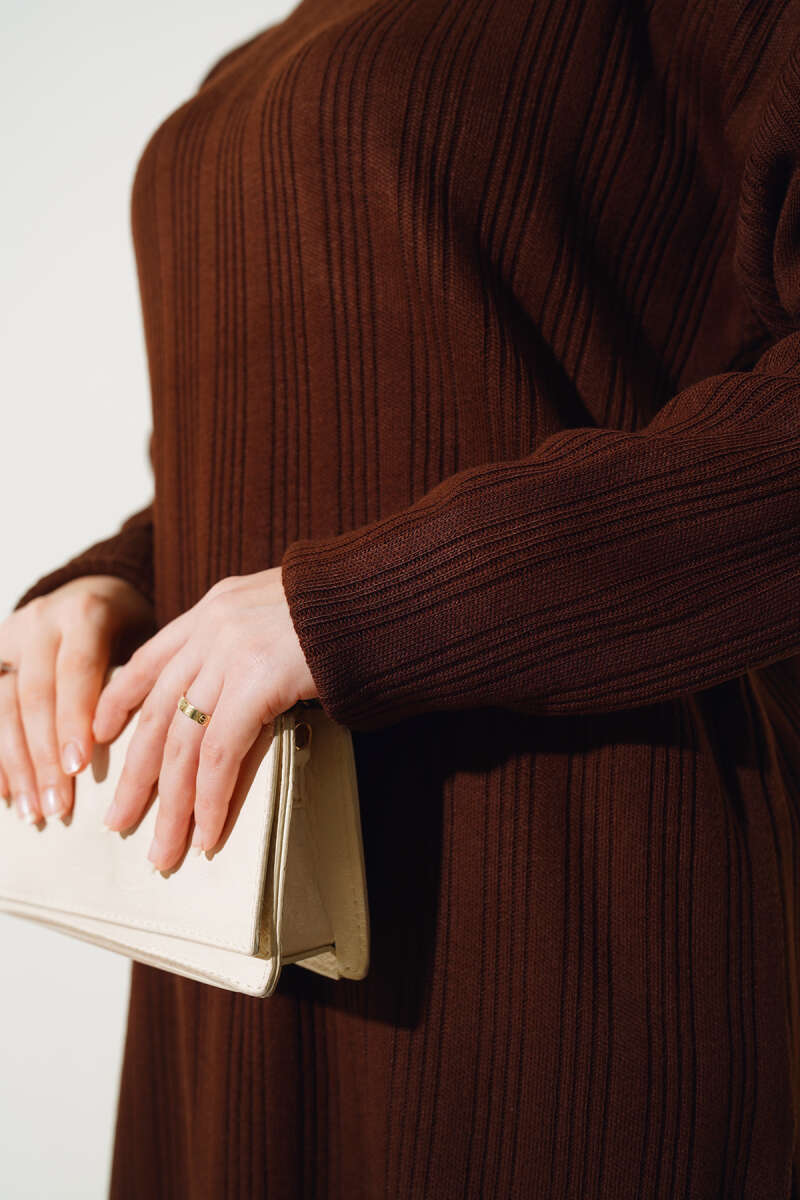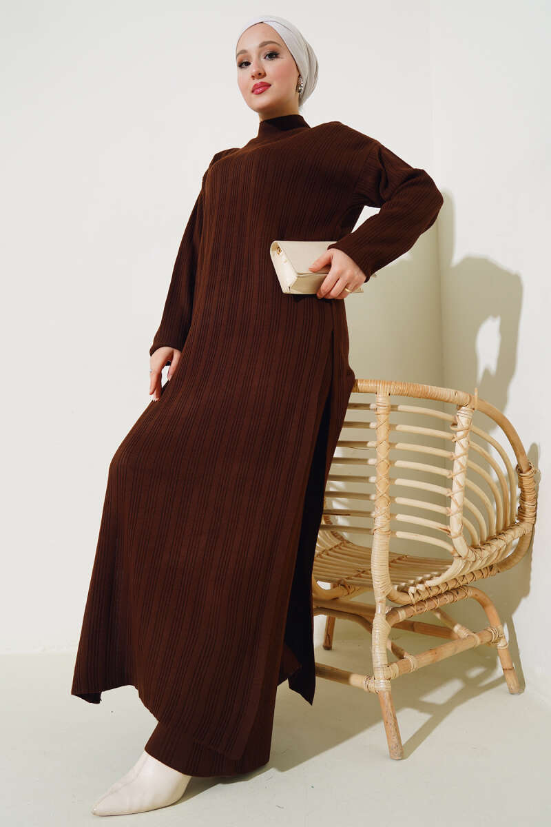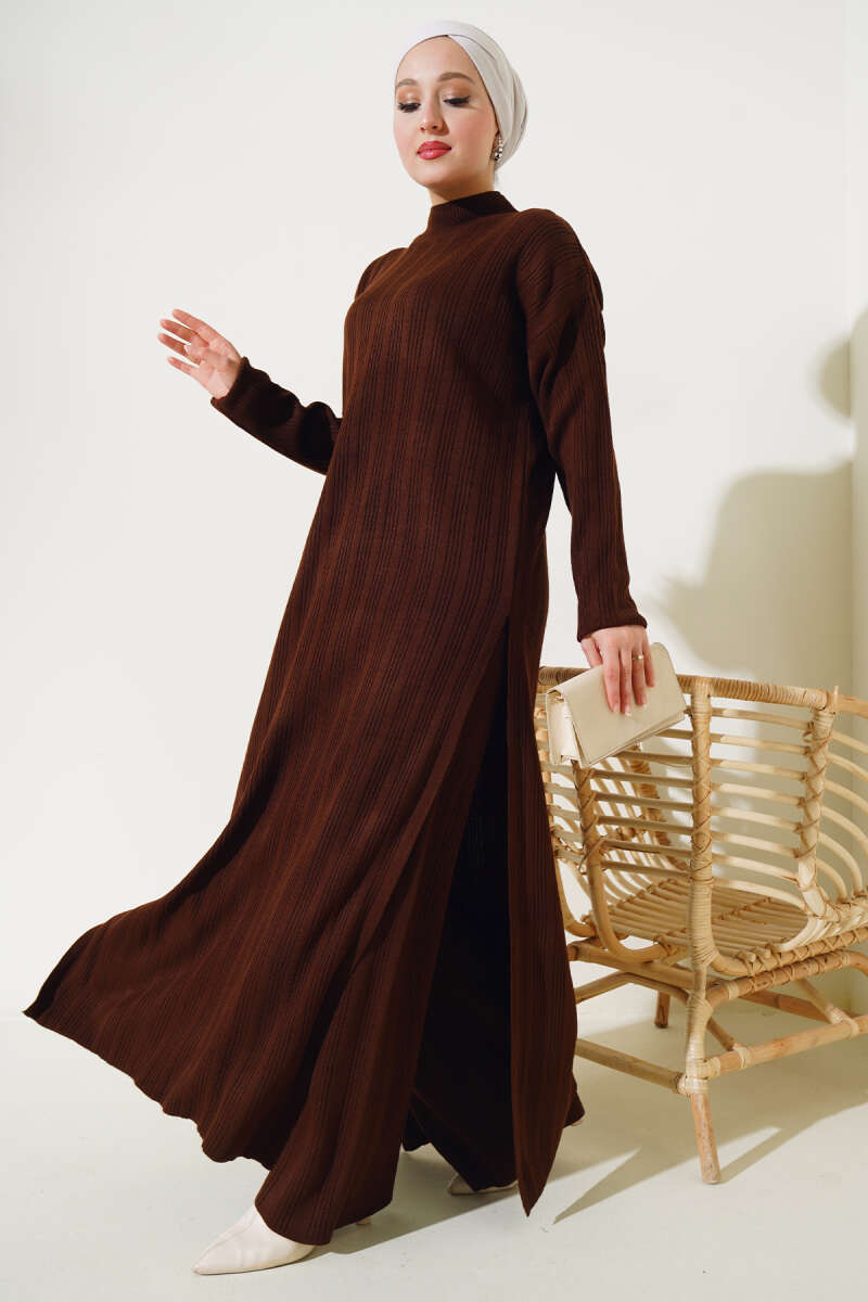 Balon Kol Balıkçı Yaka Triko İkili Takım Kahve