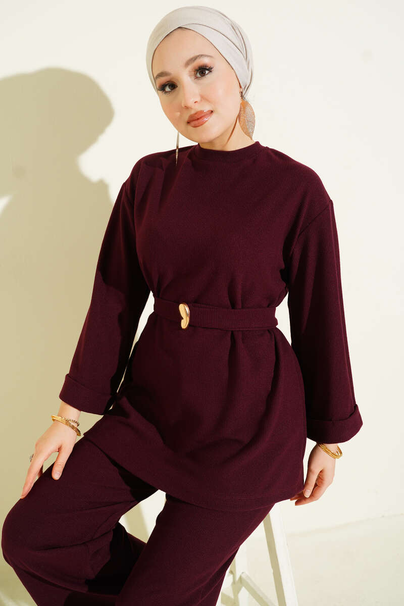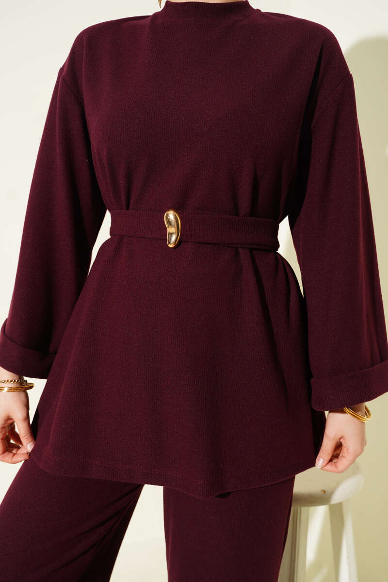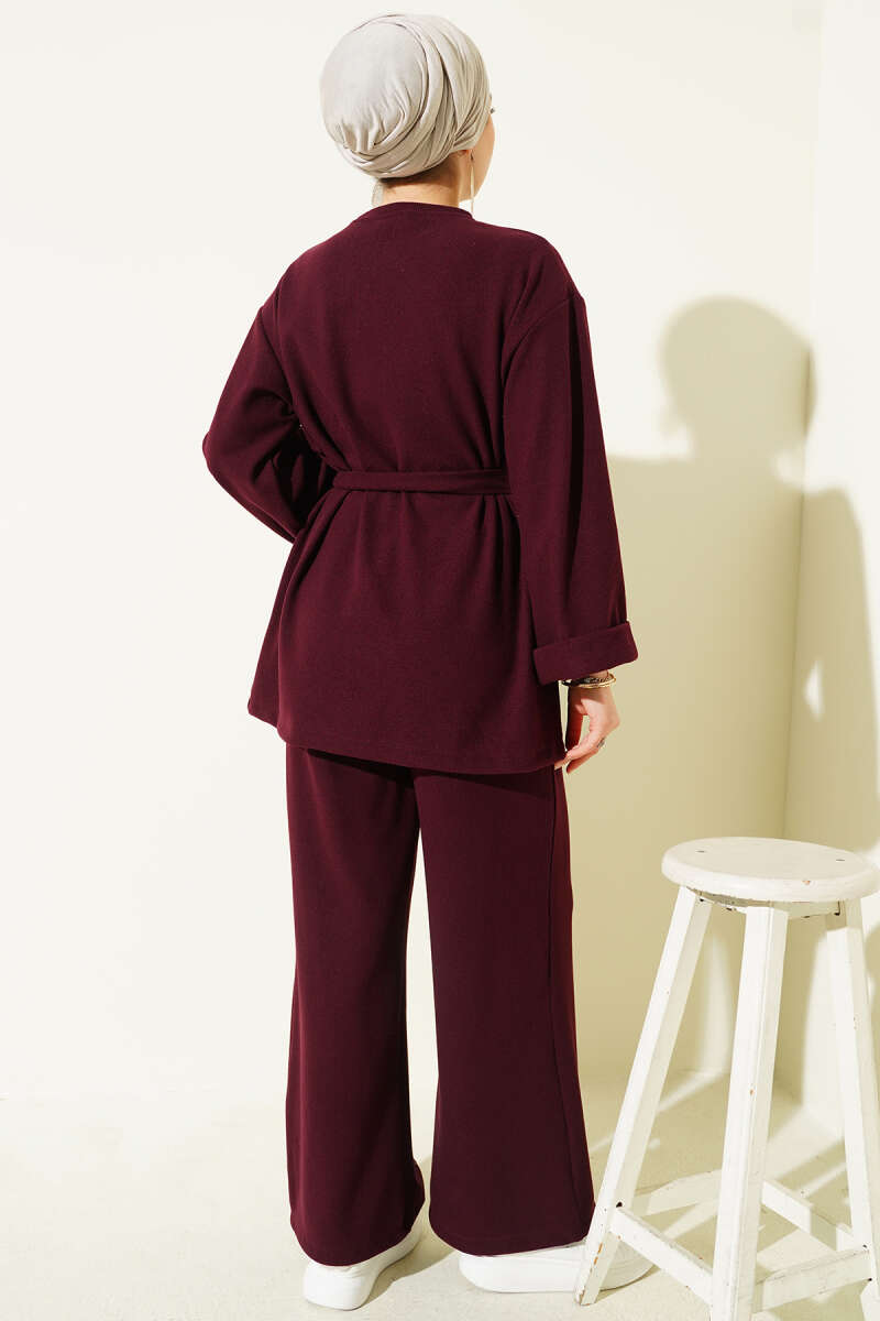 Yarım Fermuarlı Loyşa Şeritli İkili Takım Bordo