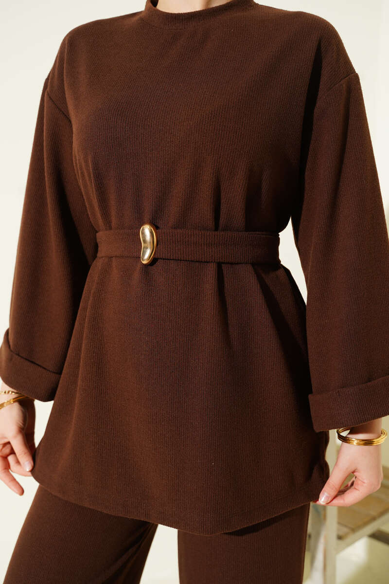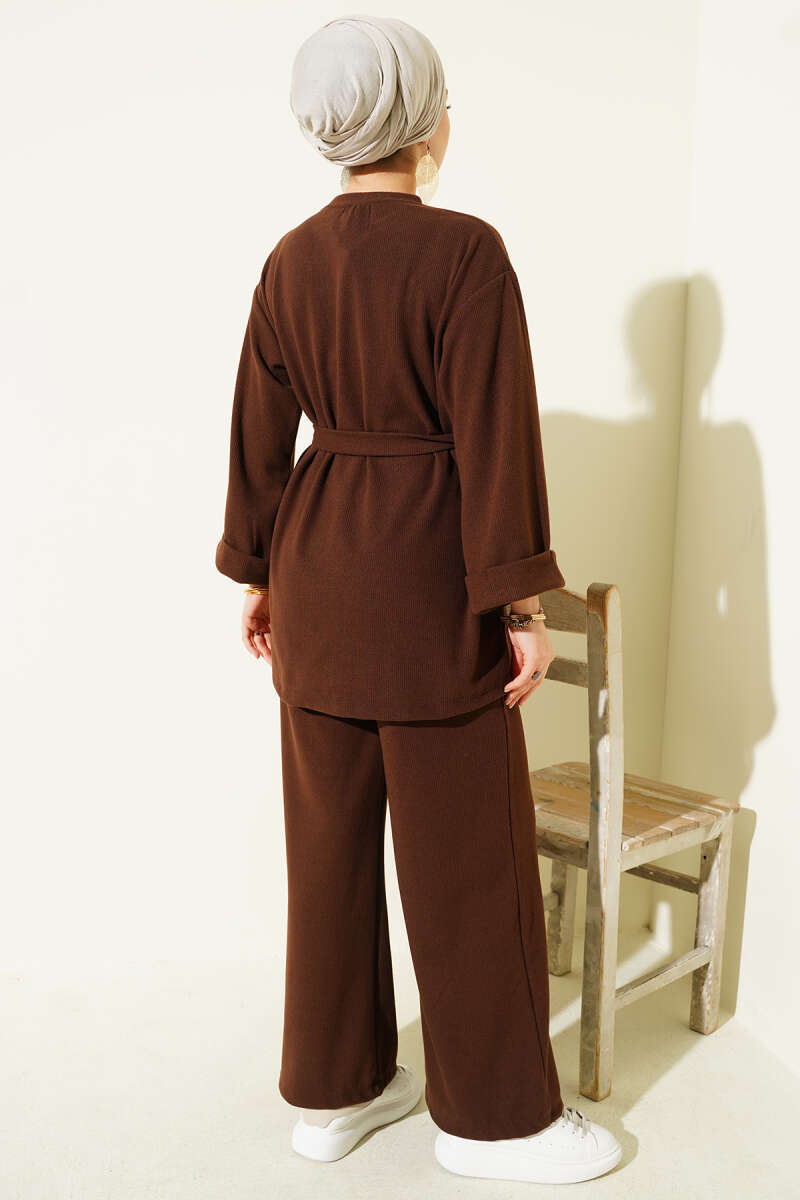 Yarım Fermuarlı Loyşa Şeritli İkili Takım Kahve