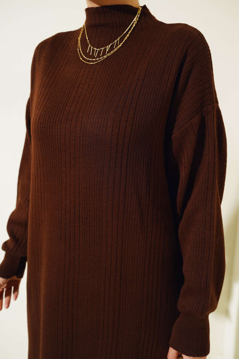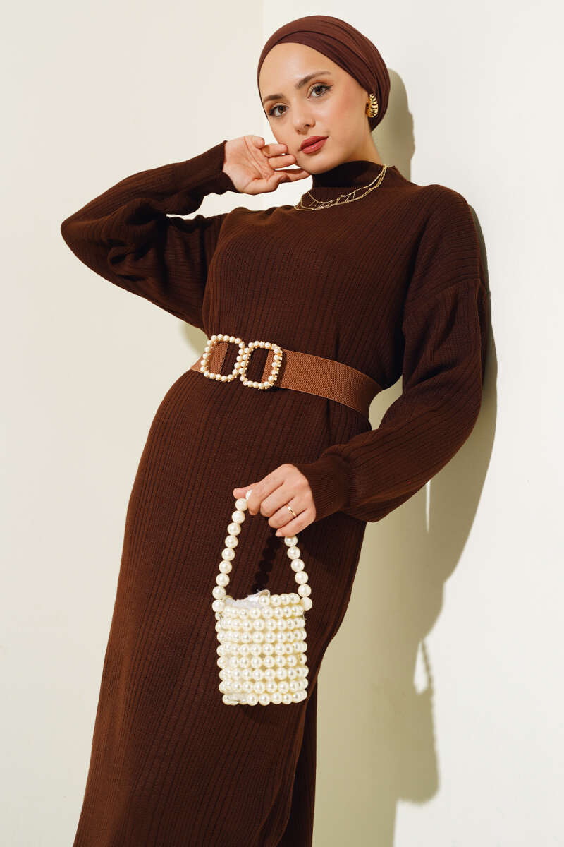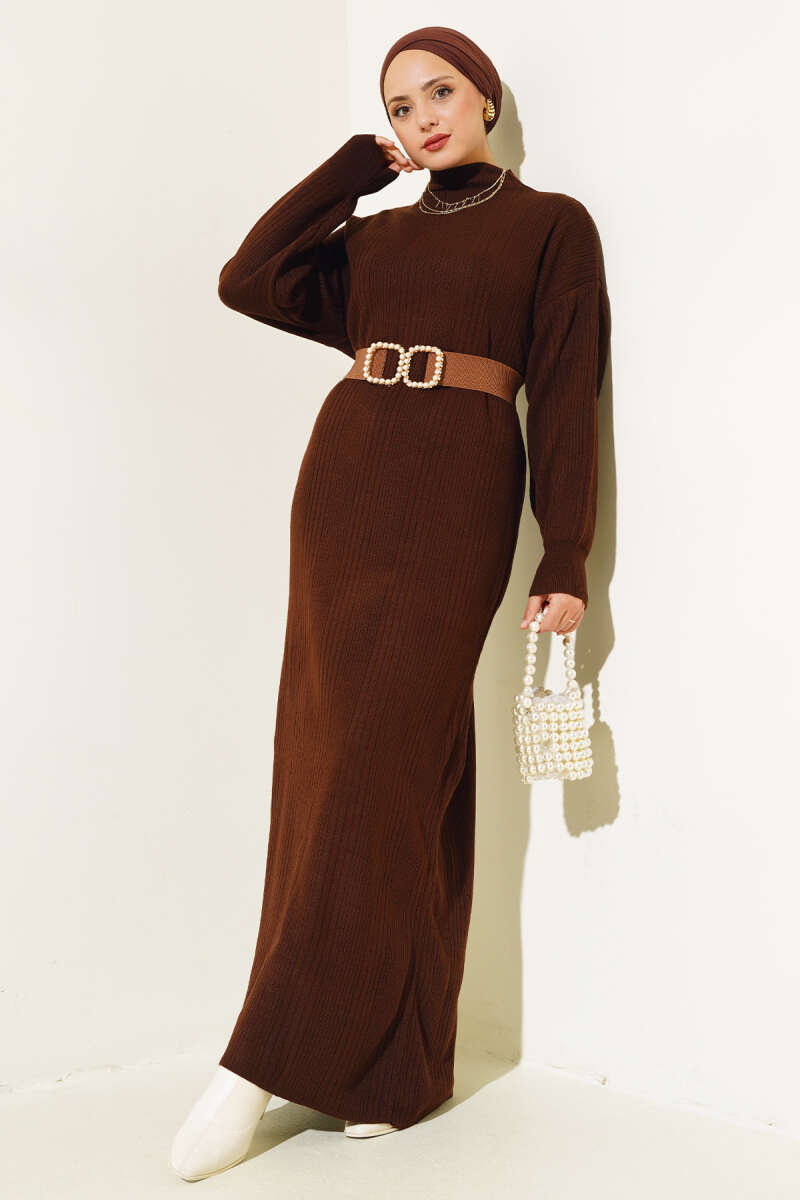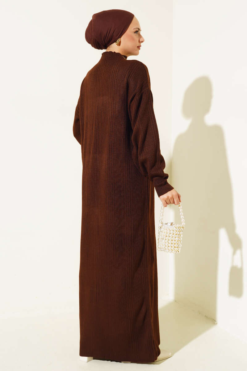 Fitilli Düz Pike Elbise Kahve