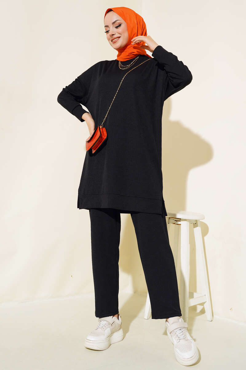 Yeni sezon ikili takım modelimiz sizlerle beraber. Tuniğimiz salaş modeldir. Omuzları düşüktür. Etek ucu yanlardan yırtmaçlıdır. Pantolonumuzun beli lastiklidir. Geniş paça modeldir. Fitilli ikili takım modelimizin renk seçenekleri mevcuttur.