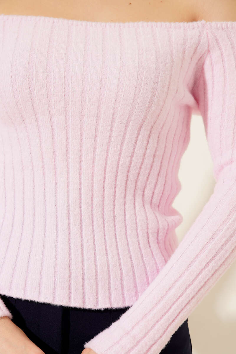 Fitilli Kayık Yaka Triko Bluz Pembe