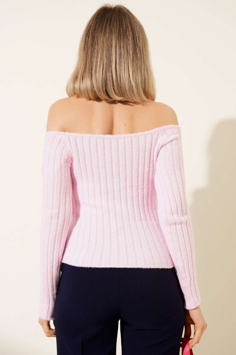 Fitilli Kayık Yaka Triko Bluz Pembe