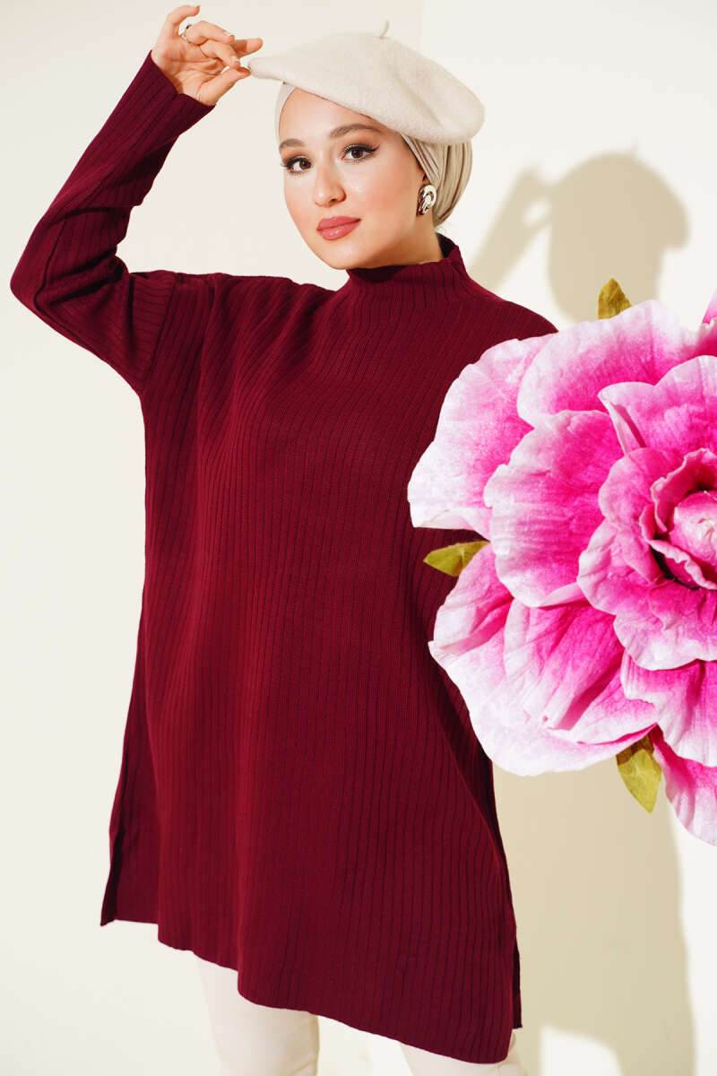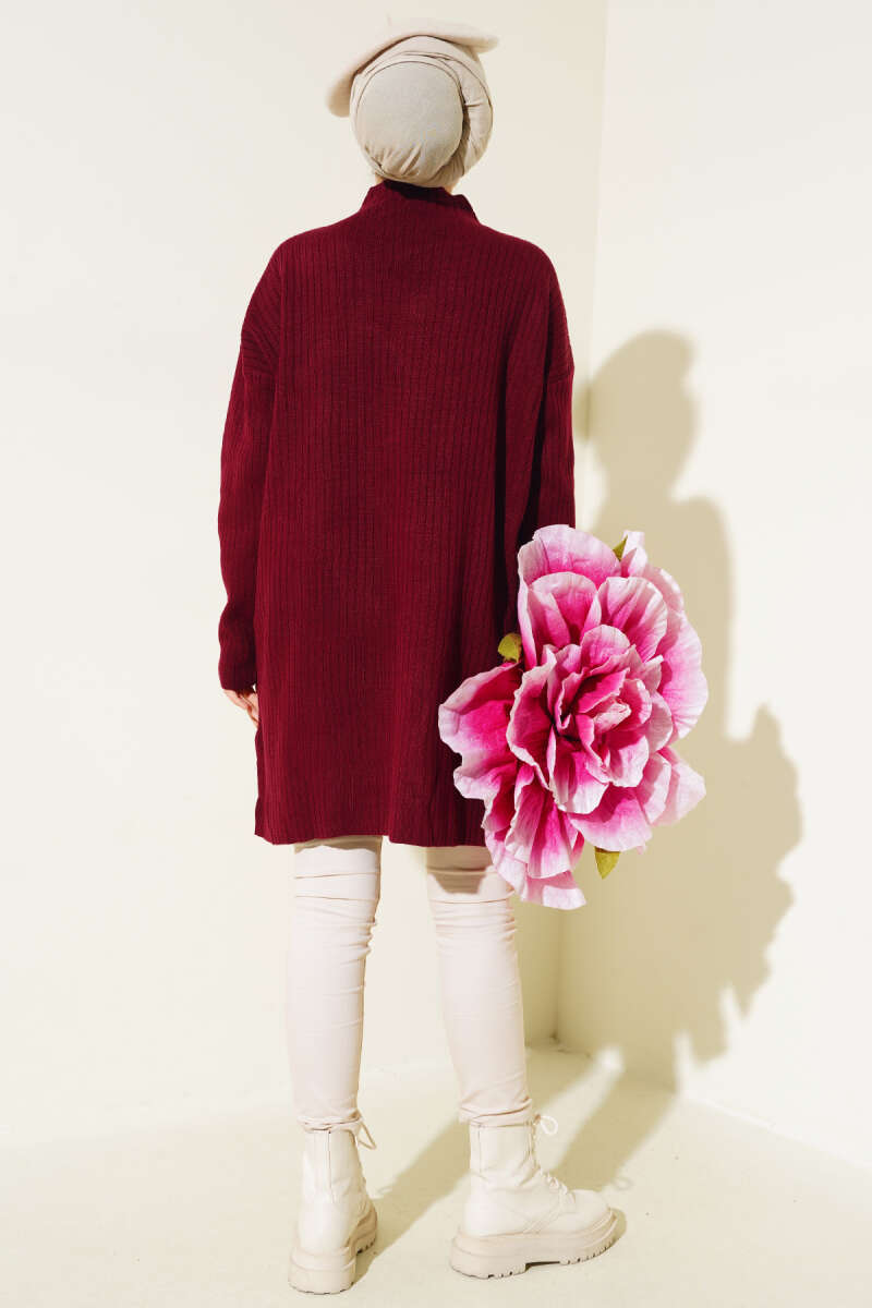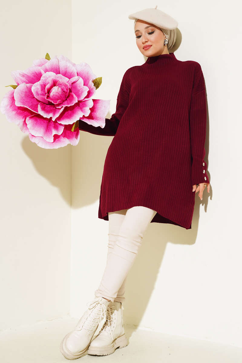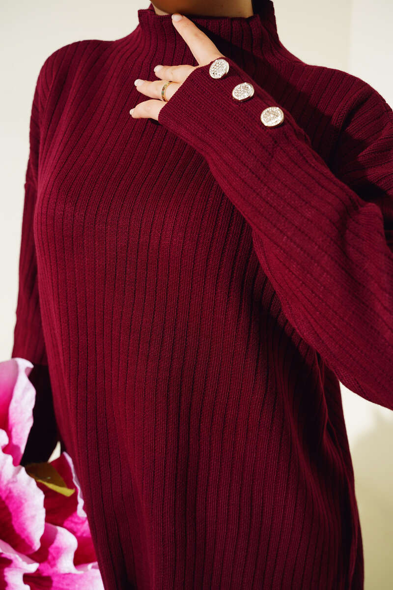 Fitilli Kol Düğme Detaylı Triko Tunik Bordo