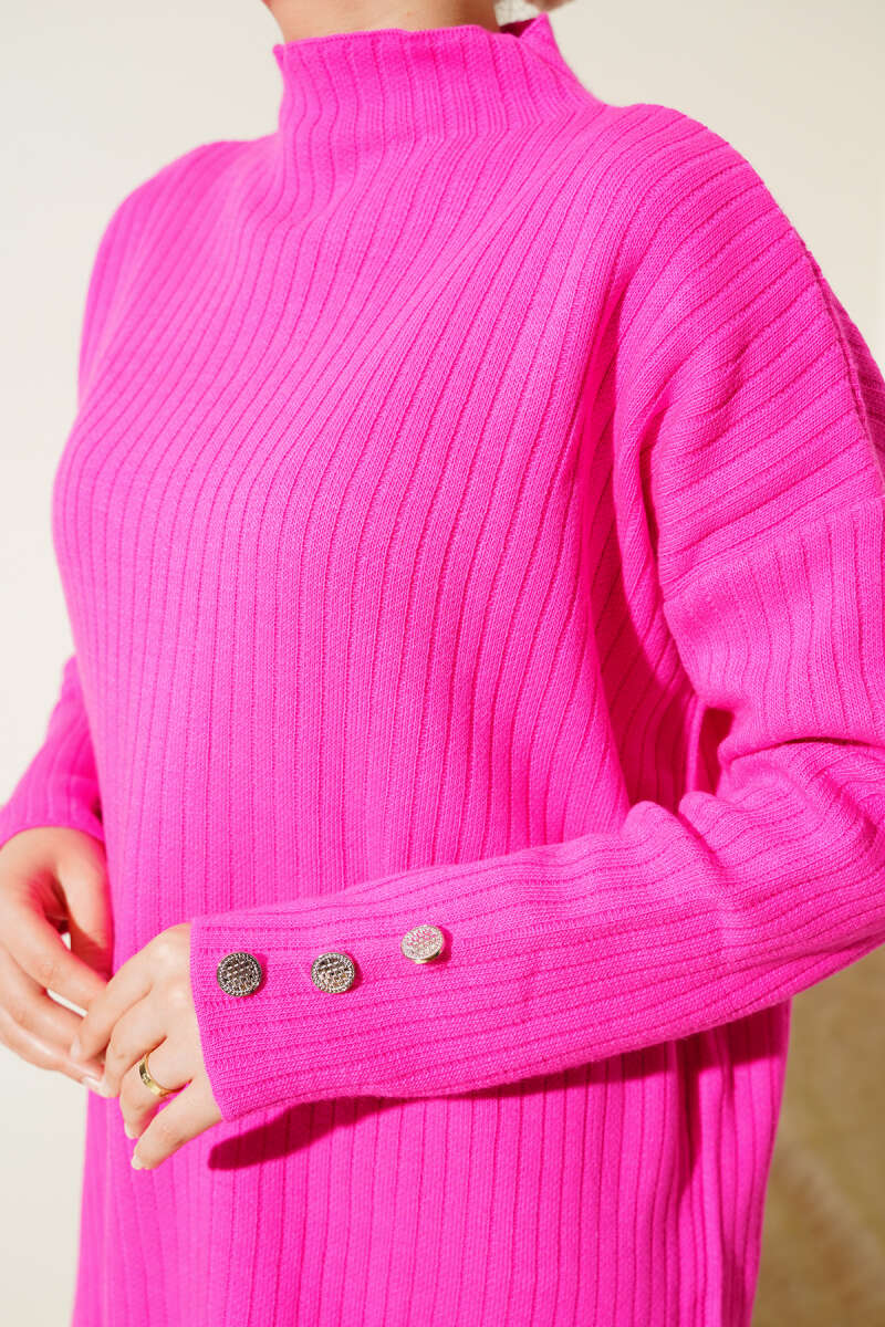 Yanları Düğmeli Yaka Fırfırlı Triko Süveter Bej