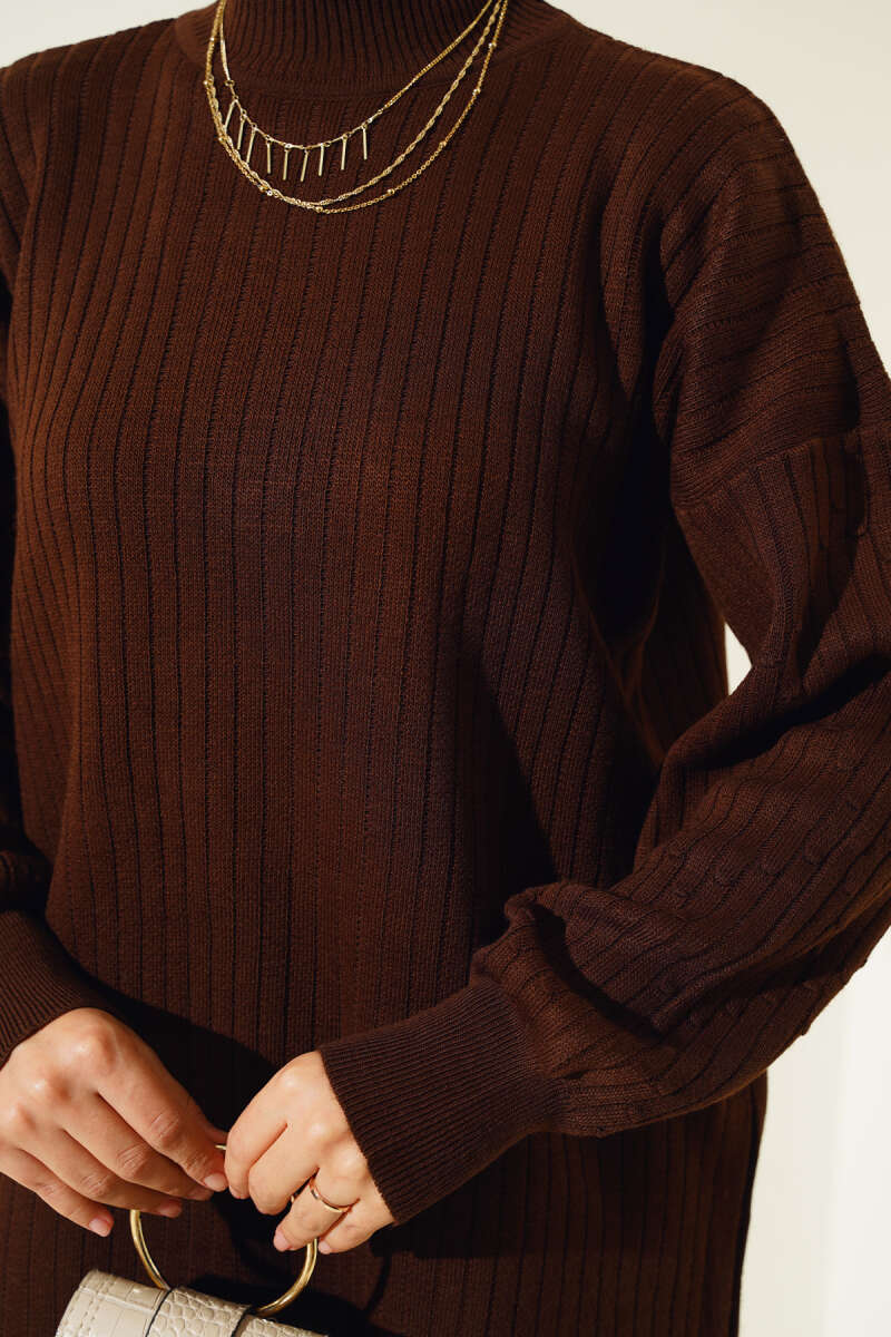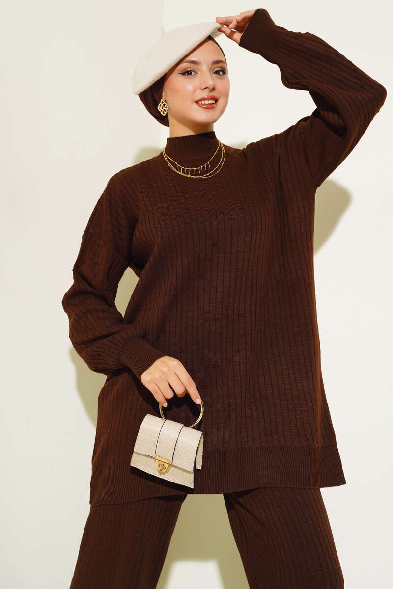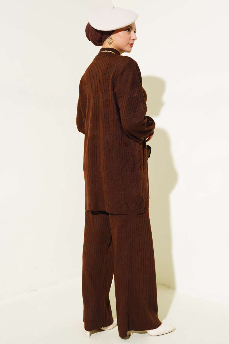 Fitilli Kol Kabartmalı Triko İkili Takım Kahve