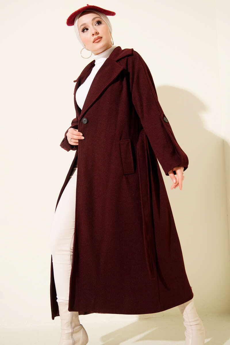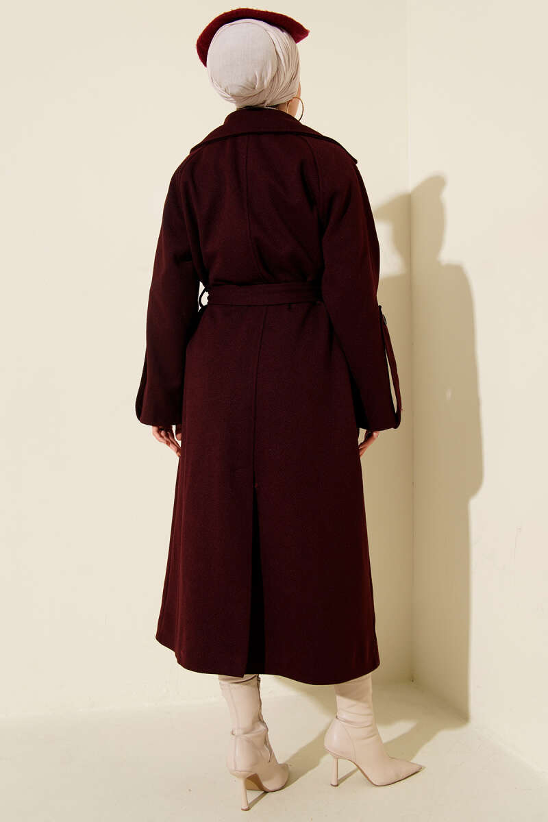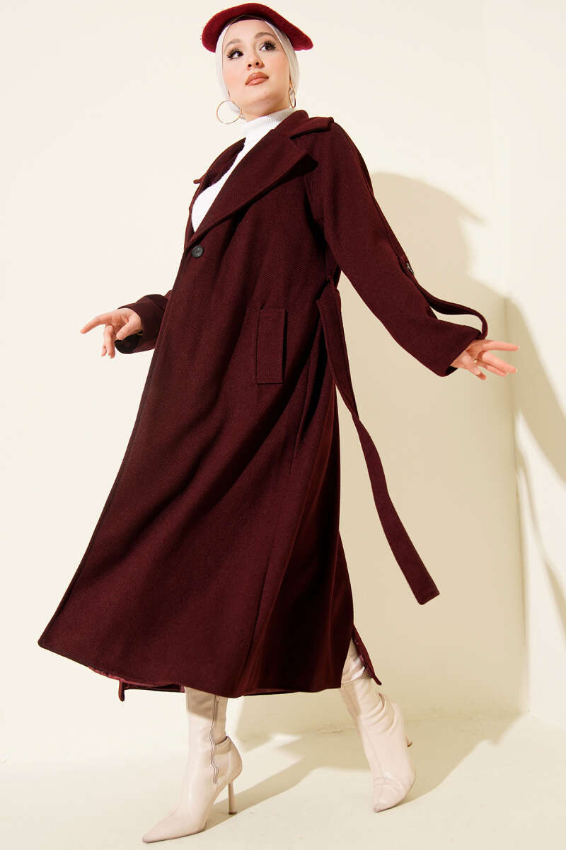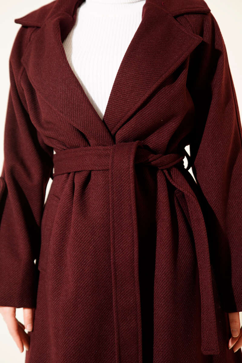 Fitilli Kuşaklı Kaşe Kaban Bordo