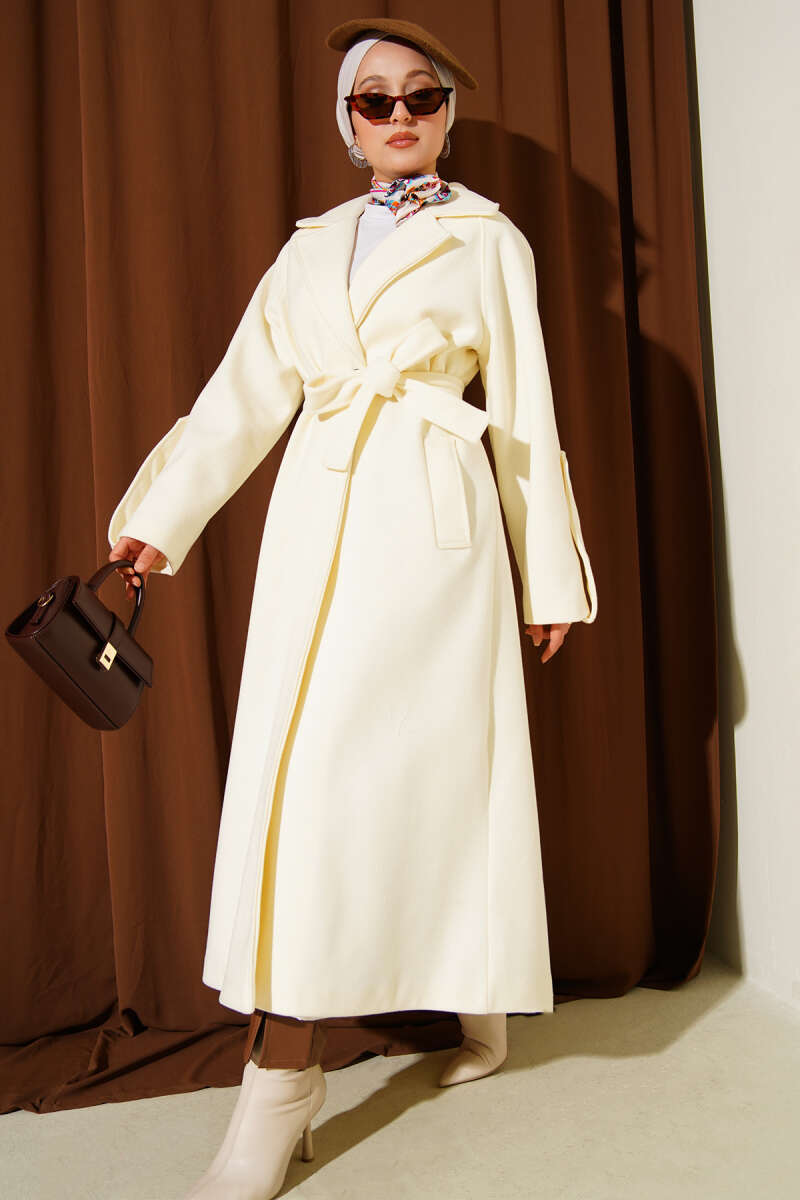 Fitilli Kuşaklı Kaşe Kaban Ekru