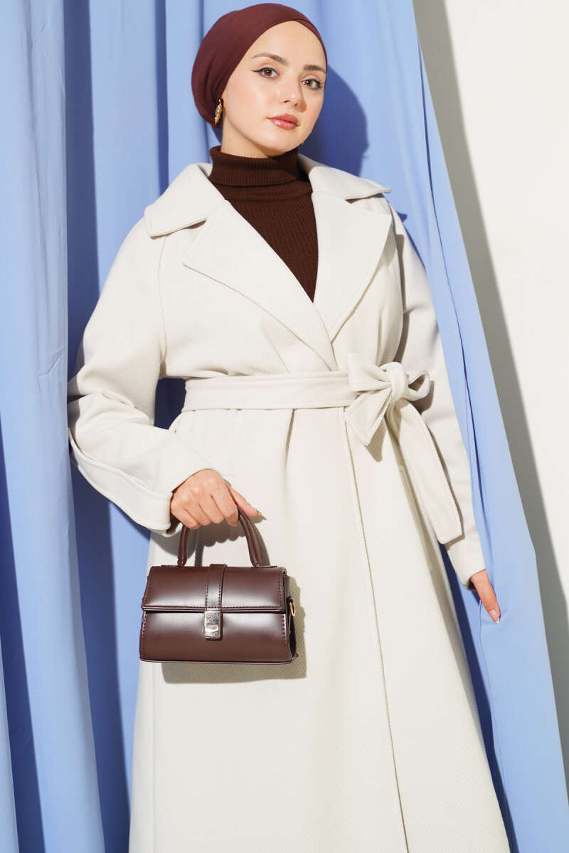 Kol Düğmeli Kuşaklı Kaşe Kaban Kestane