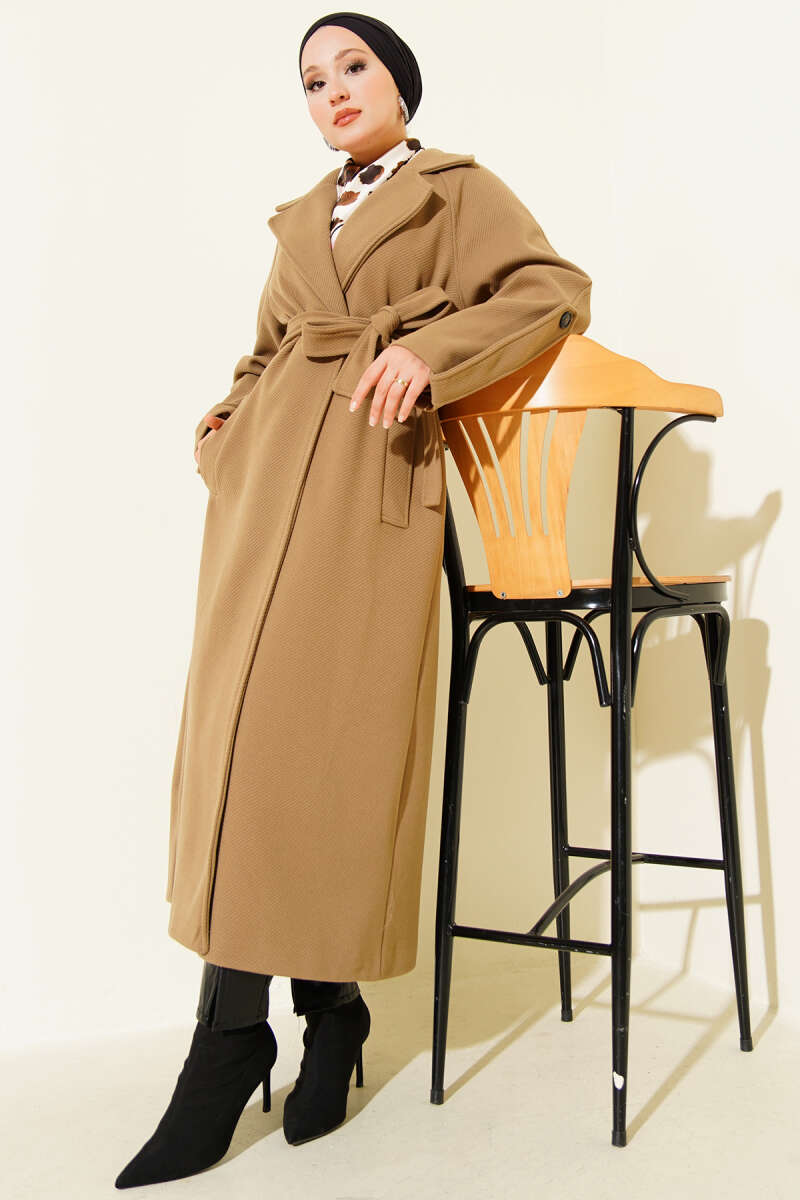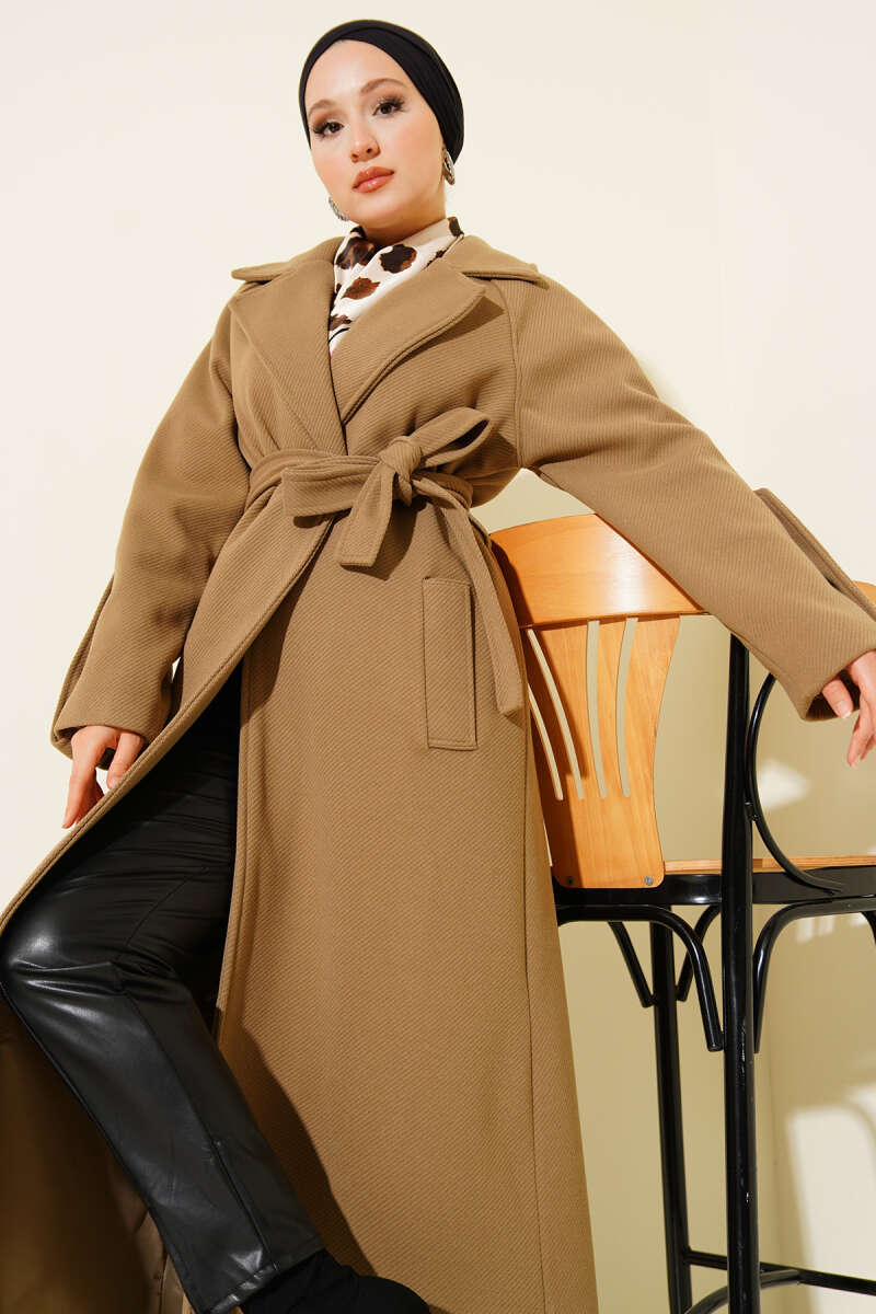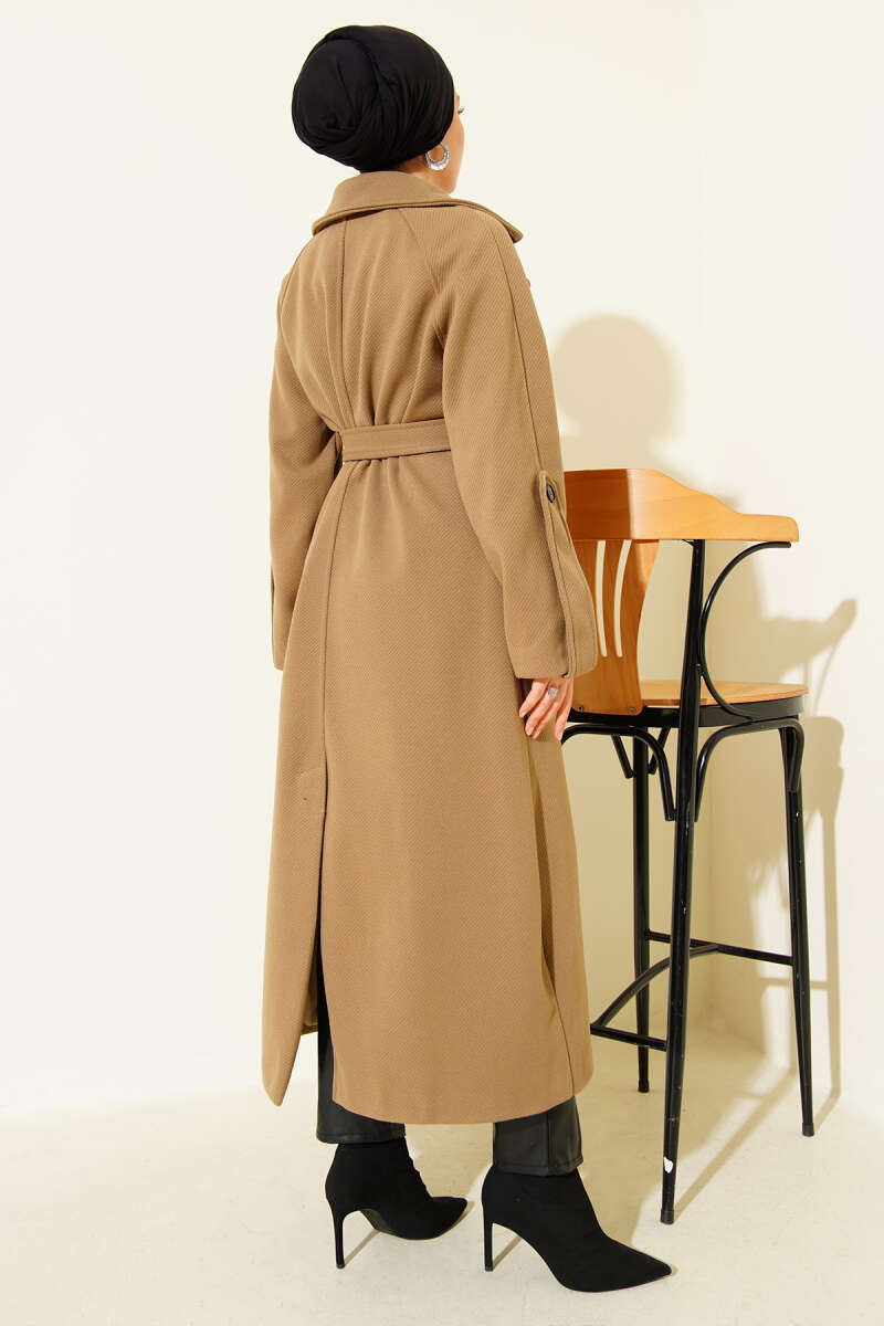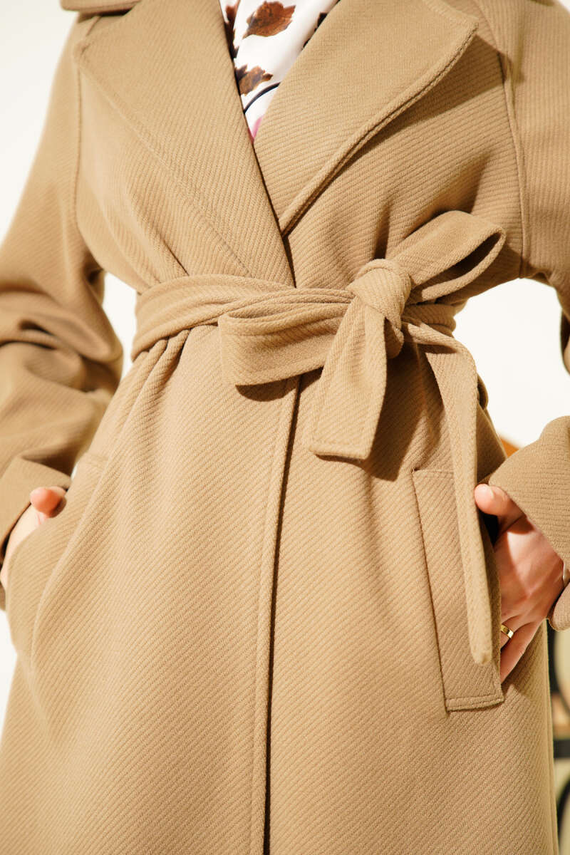 Kruvaze Yaka Kuşaklı Kaşe Kaban Camel