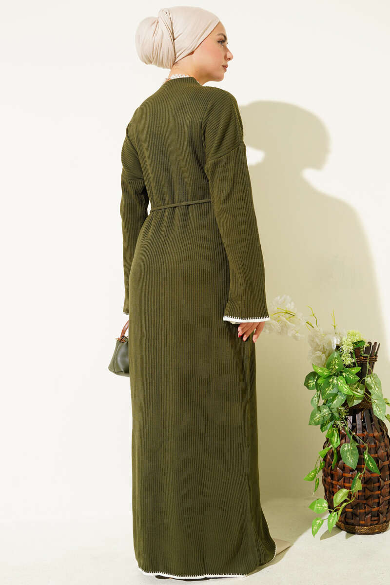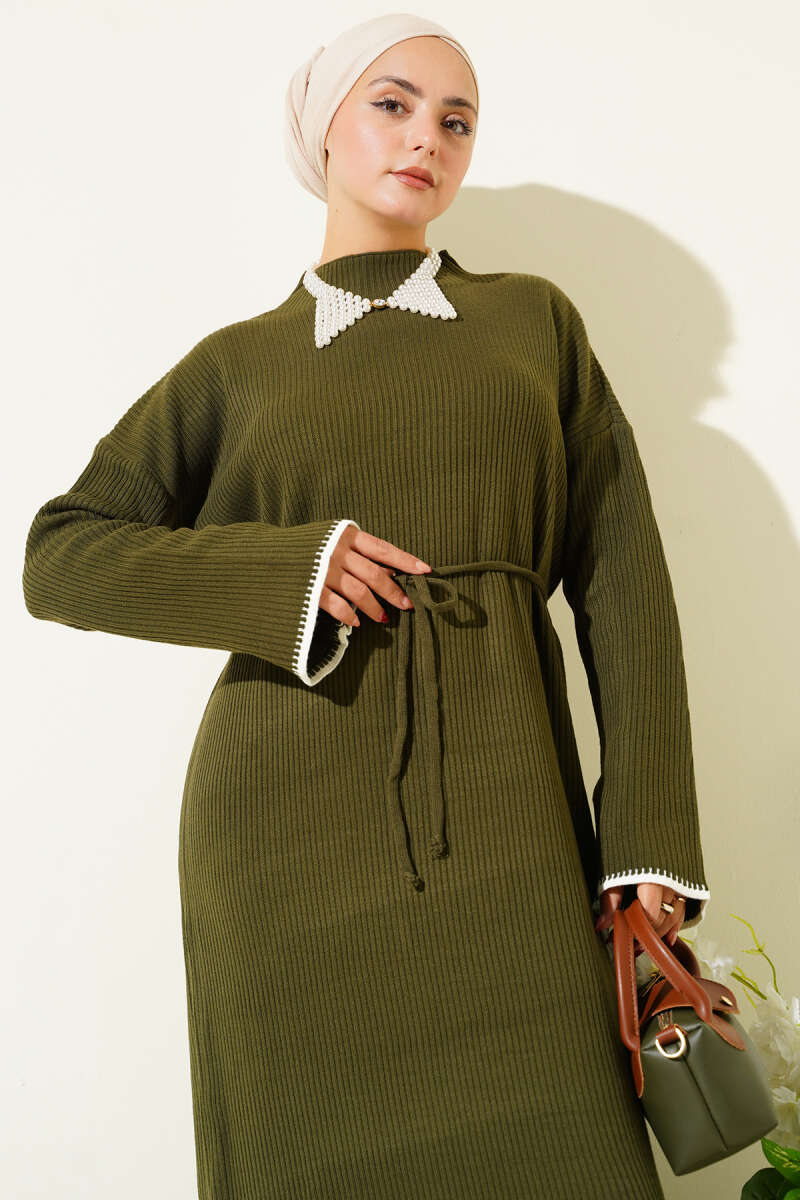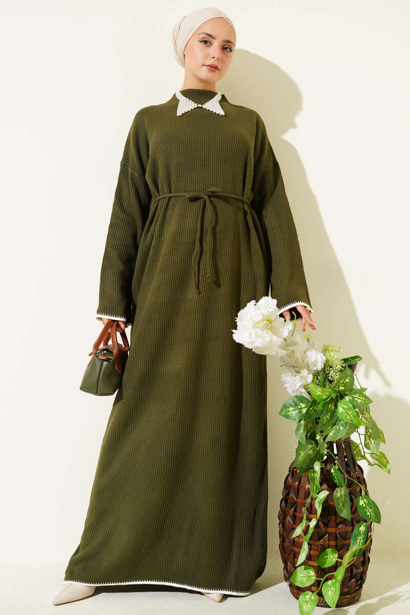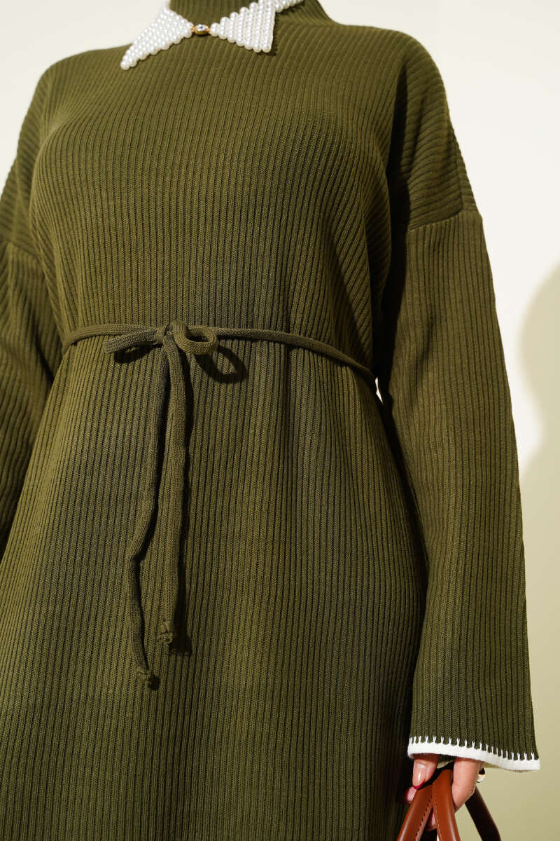 Fitilli Nakış Detaylı Triko Elbise Haki