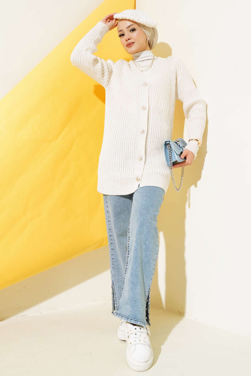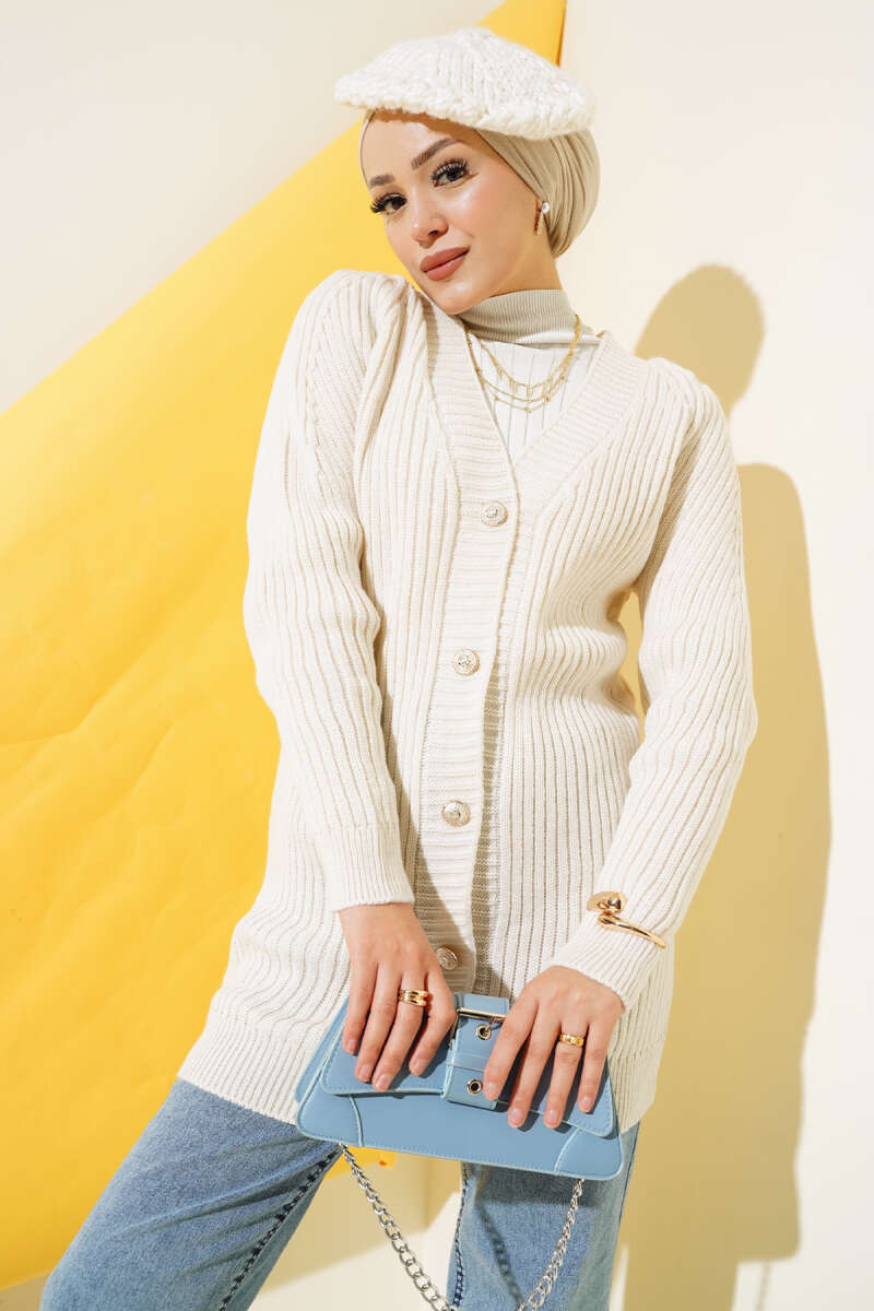 Şal Yaka Pirinç Örgü Triko Hırka Ekru
