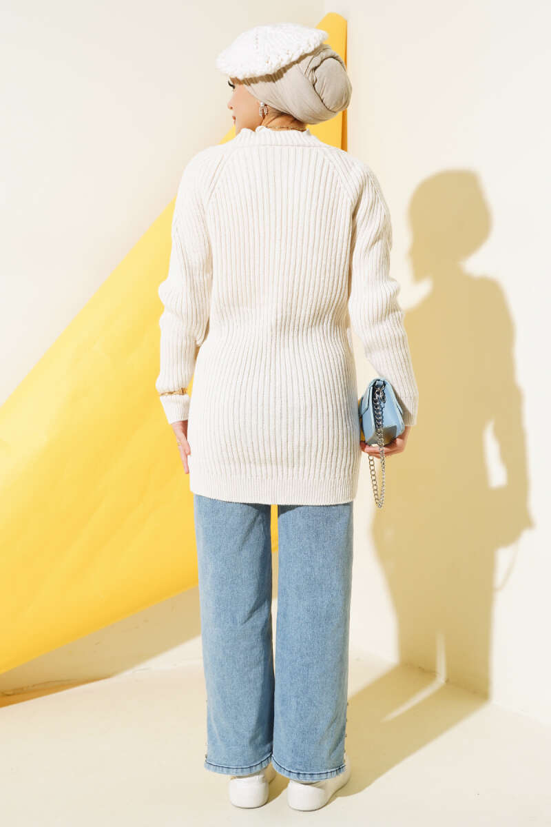 Düğmeli Cepli Uzun Triko Hırka Latte