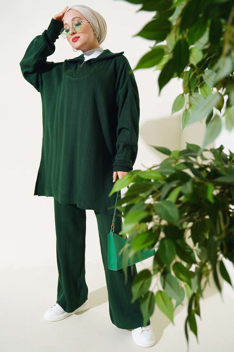 Kapüşonlu Yanları Taşlı İkili Takım Zümrüt