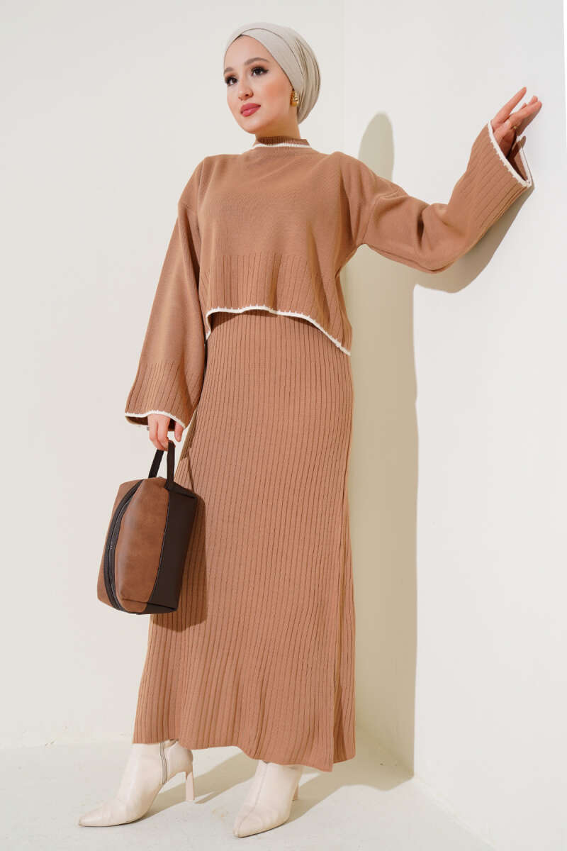 Balıkçı Yaka Fitilli Triko İkili Takım Vizon