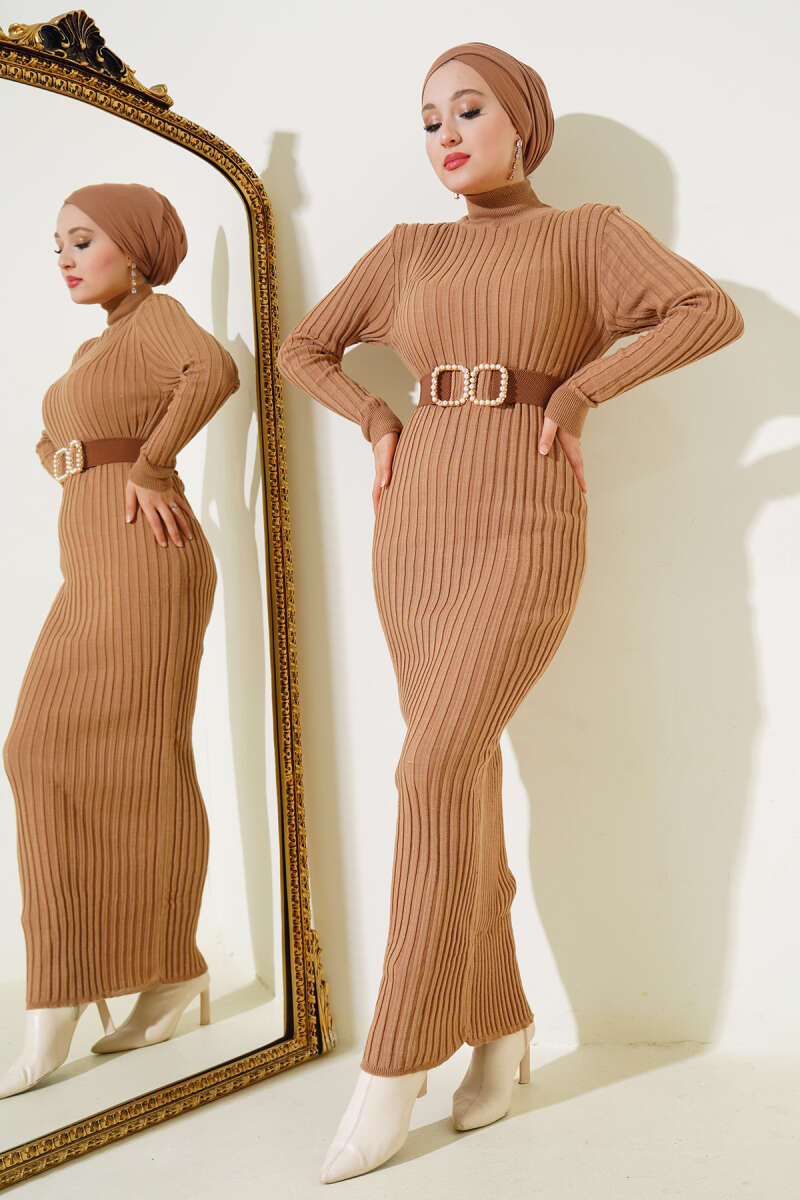Kuşaklı Dik Fitilli Kaşe Elbise Latte
