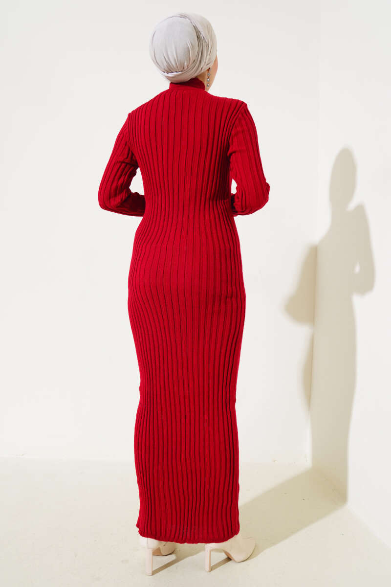 Yakası Yarım Fermuarlı Triko Elbise Bordo