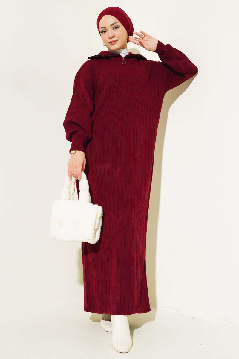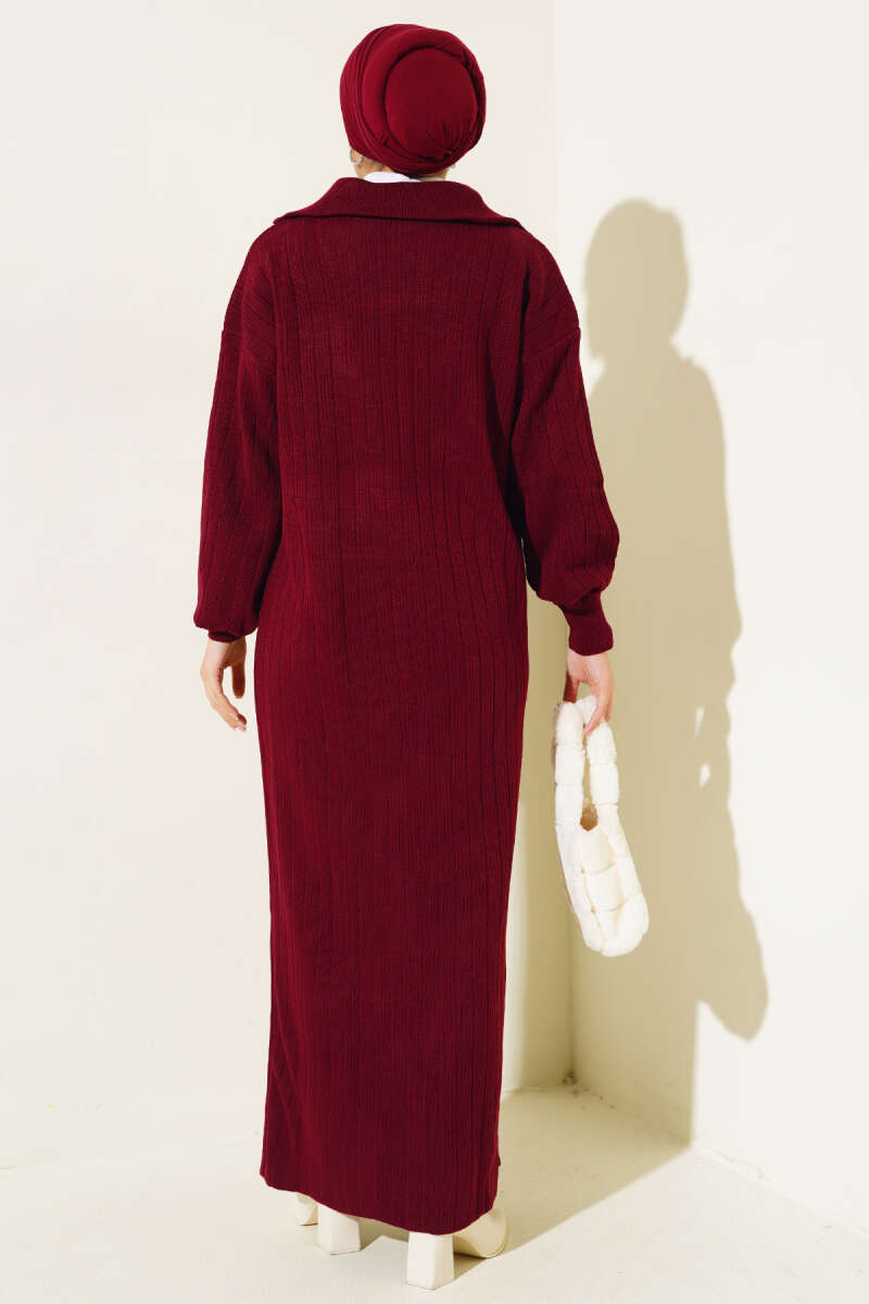 Gömlek Yaka Düğmeli Triko Elbise Bordo