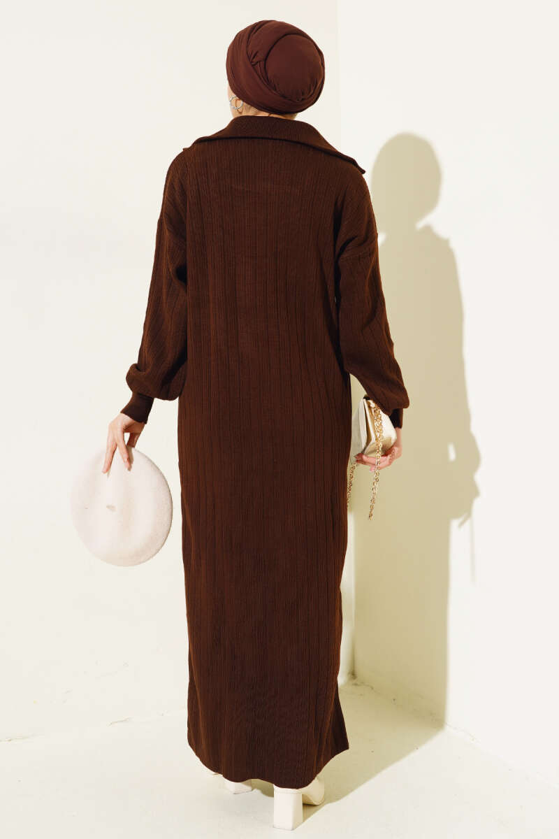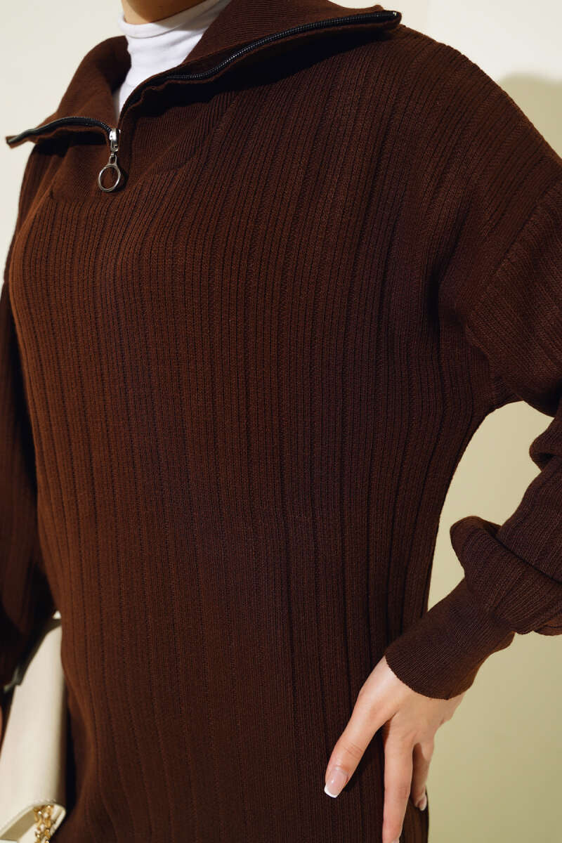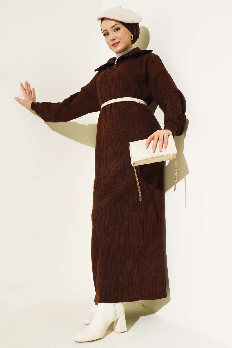 Fitilli Yarım Fermuarlı Düz Triko Elbise Kahve