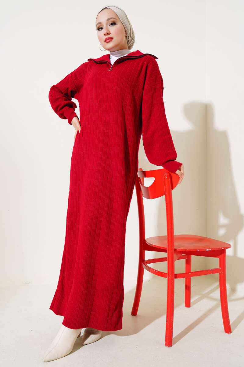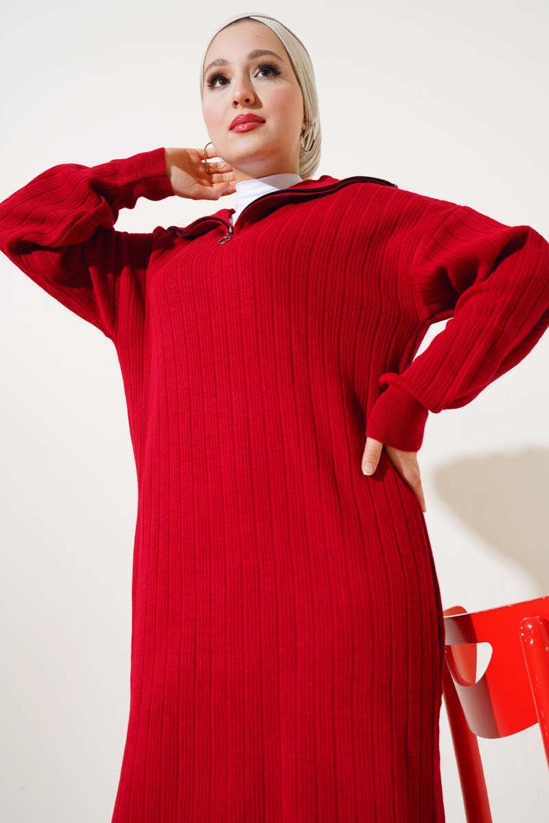 Çizgi Gömlek Garnili Triko Elbise Füme