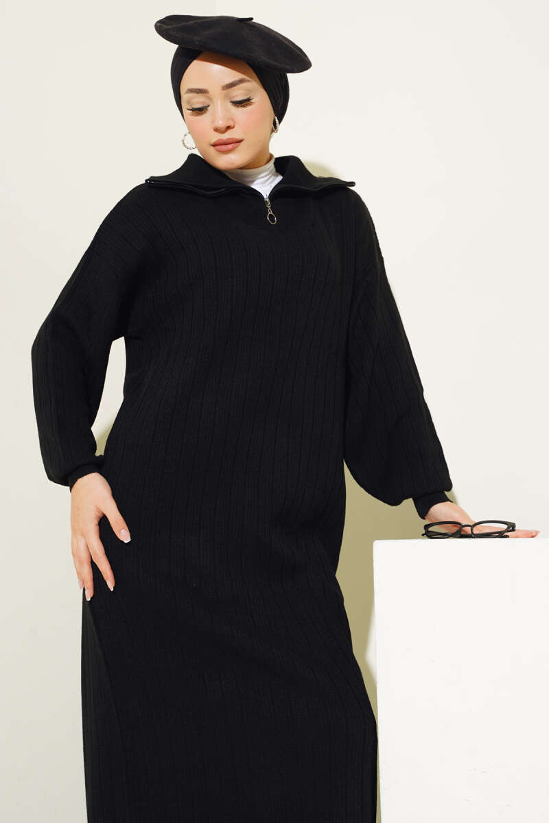 Fitilli Yarım Fermuarlı Düz Triko Elbise Lacivert