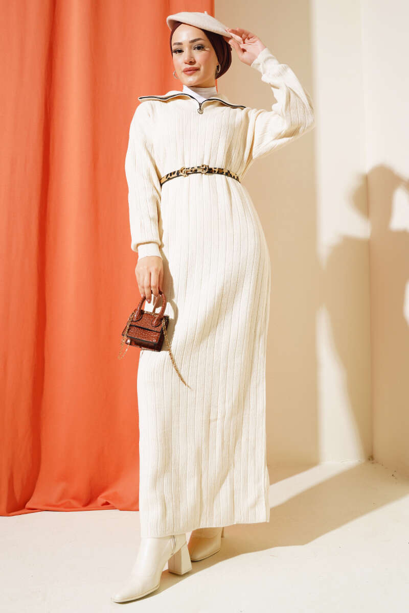 Kuşaklı Dik Fitilli Kaşe Elbise Latte